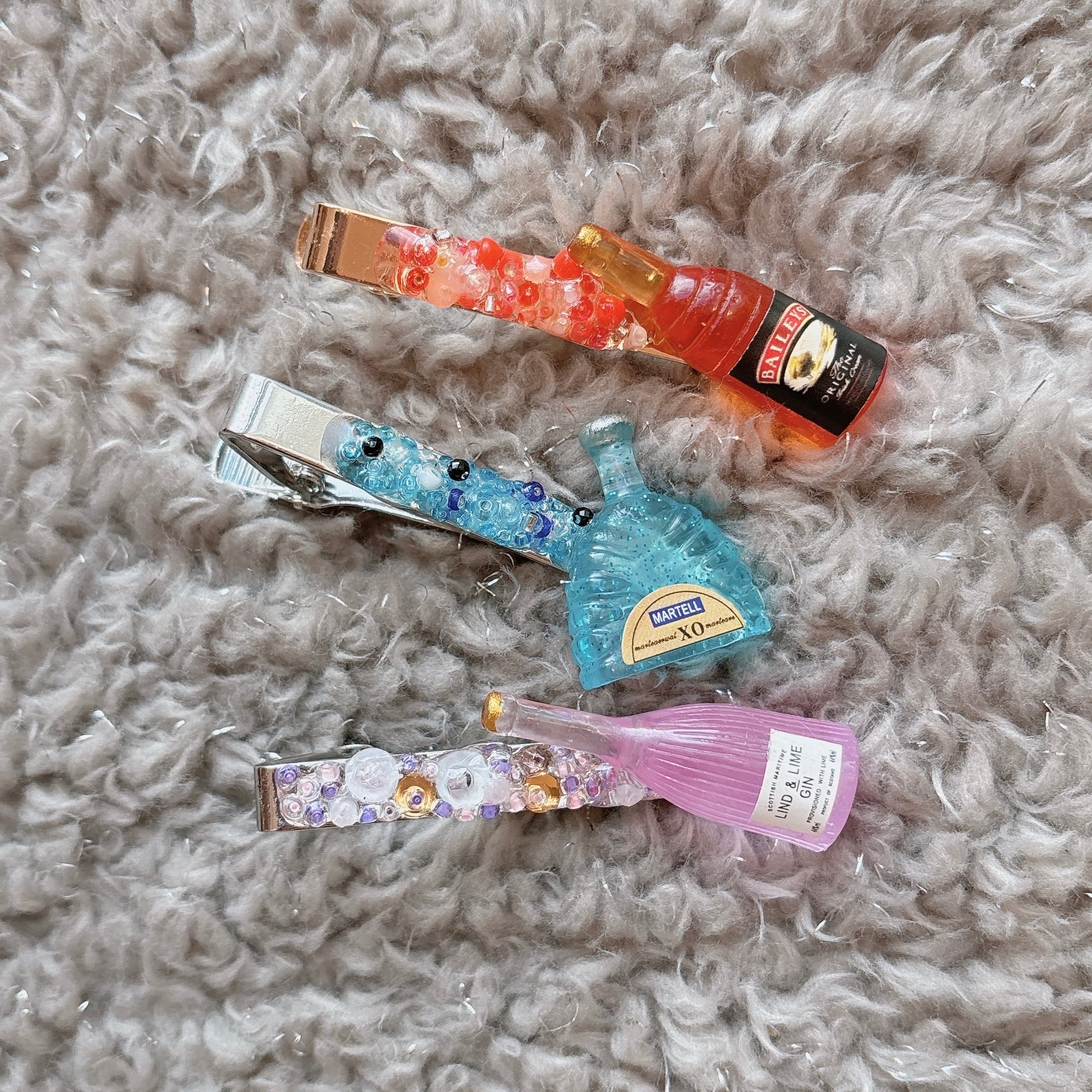 小さなお酒のボトルのパーツとビーズを組み合わせて作った、遊び心のあるネクタイピンです。