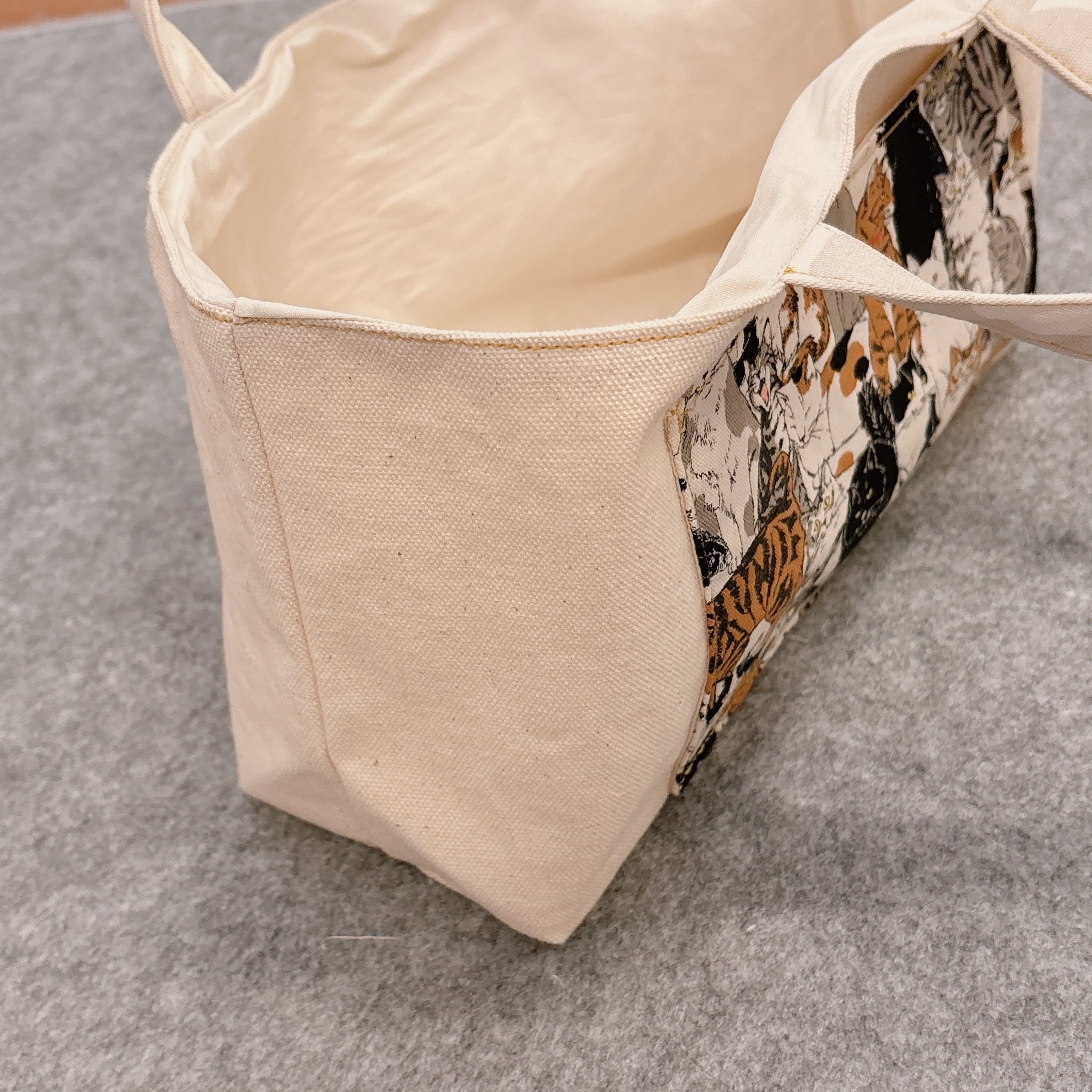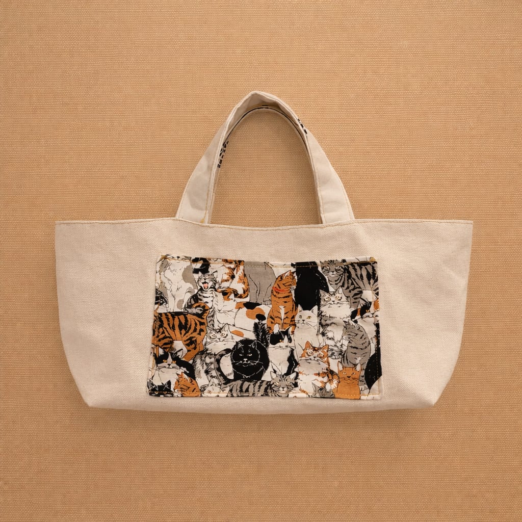 生成りのキャンバス地に、猫のイラスト柄ポケットをあしらったトートバッグ。