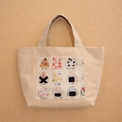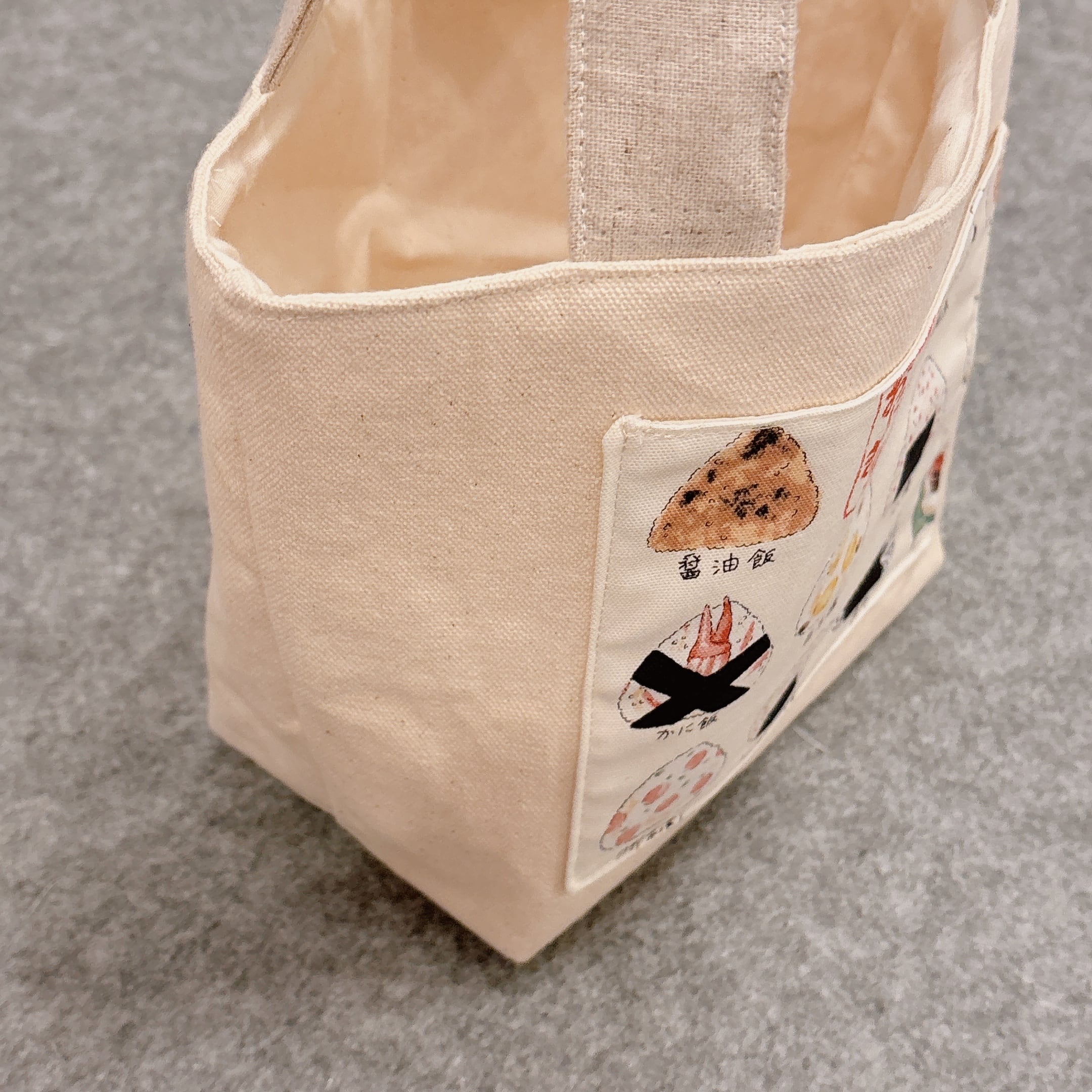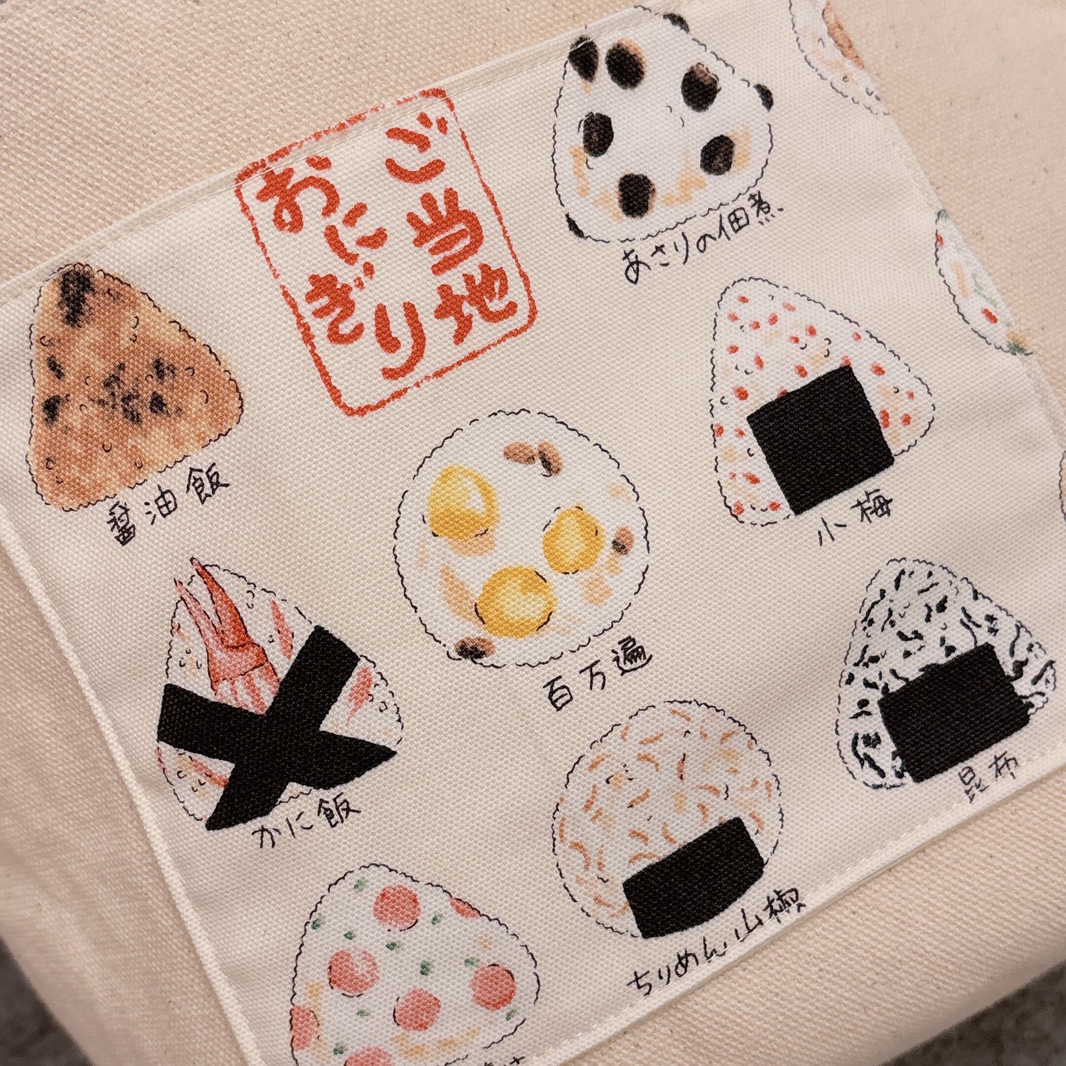 生成りのキャンバス地に、ご当地おにぎりのイラスト柄ポケットをあしらったトートバッグ。