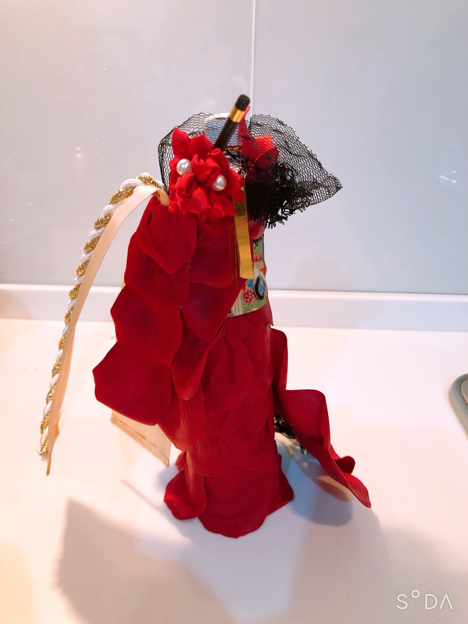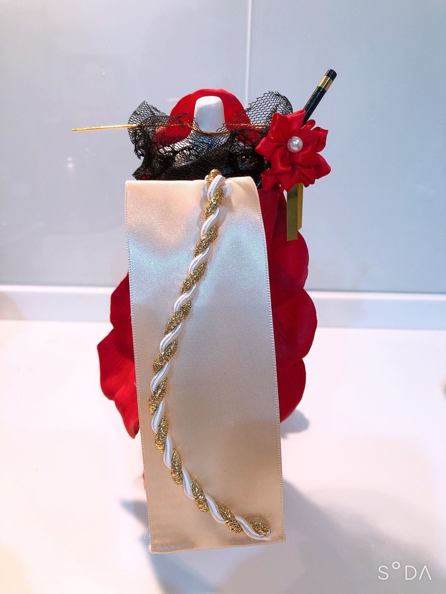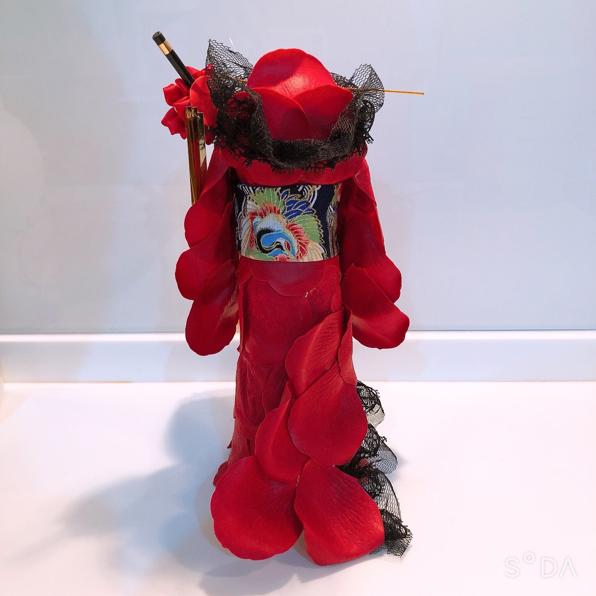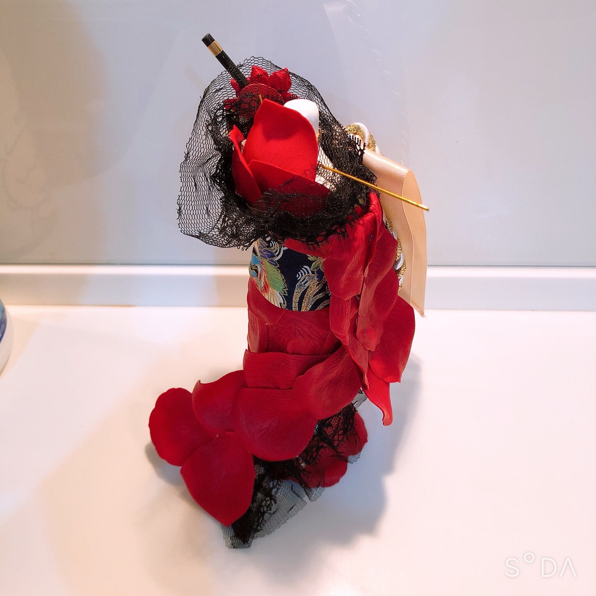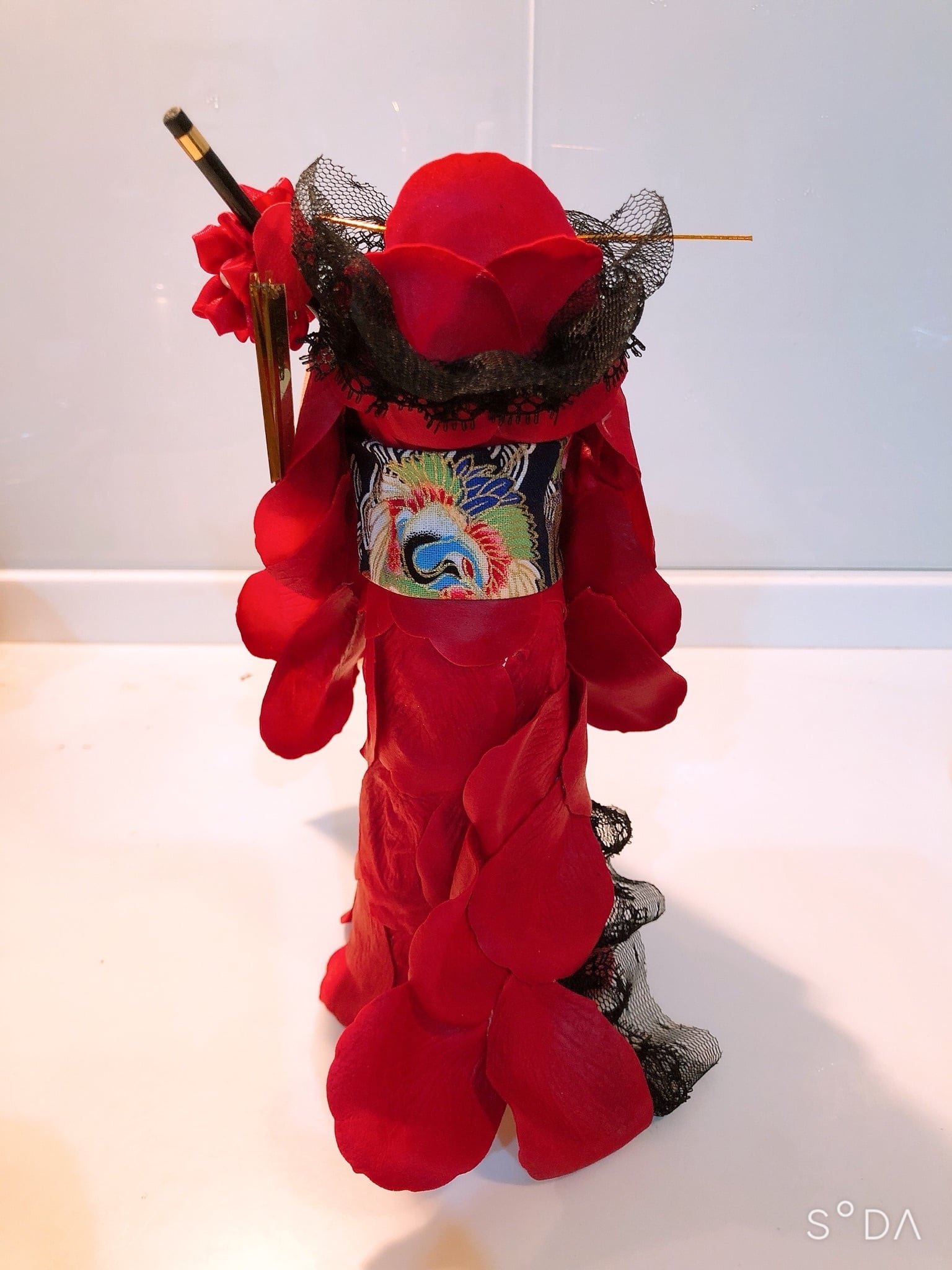 パフュームフラワーという造花を使って、赤い着物を着たドールを作りました。