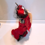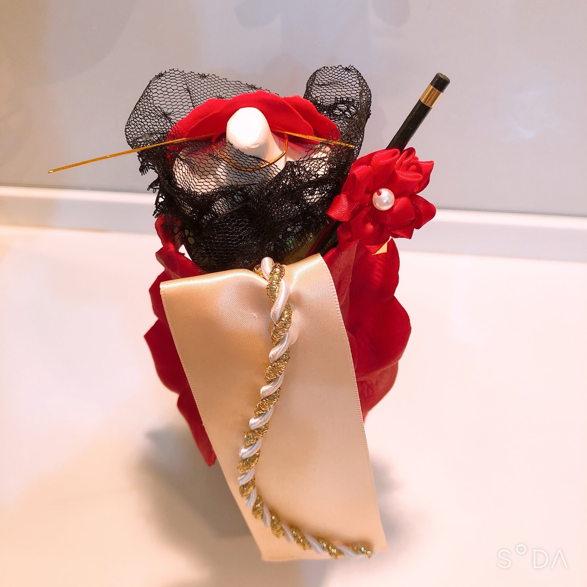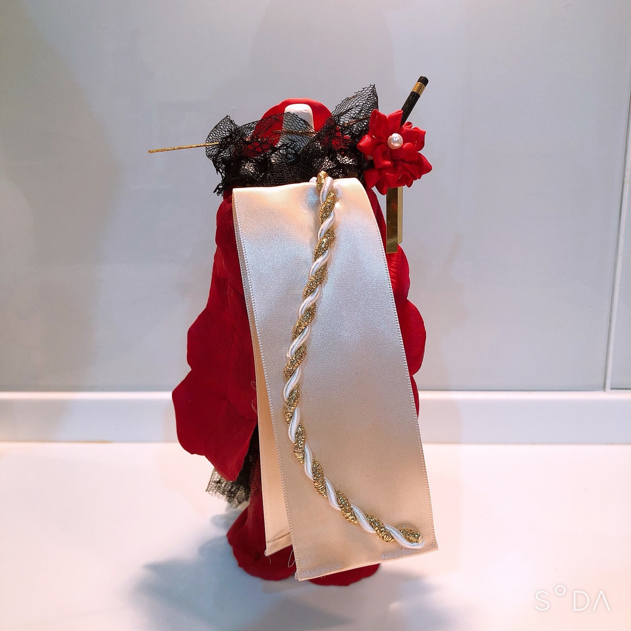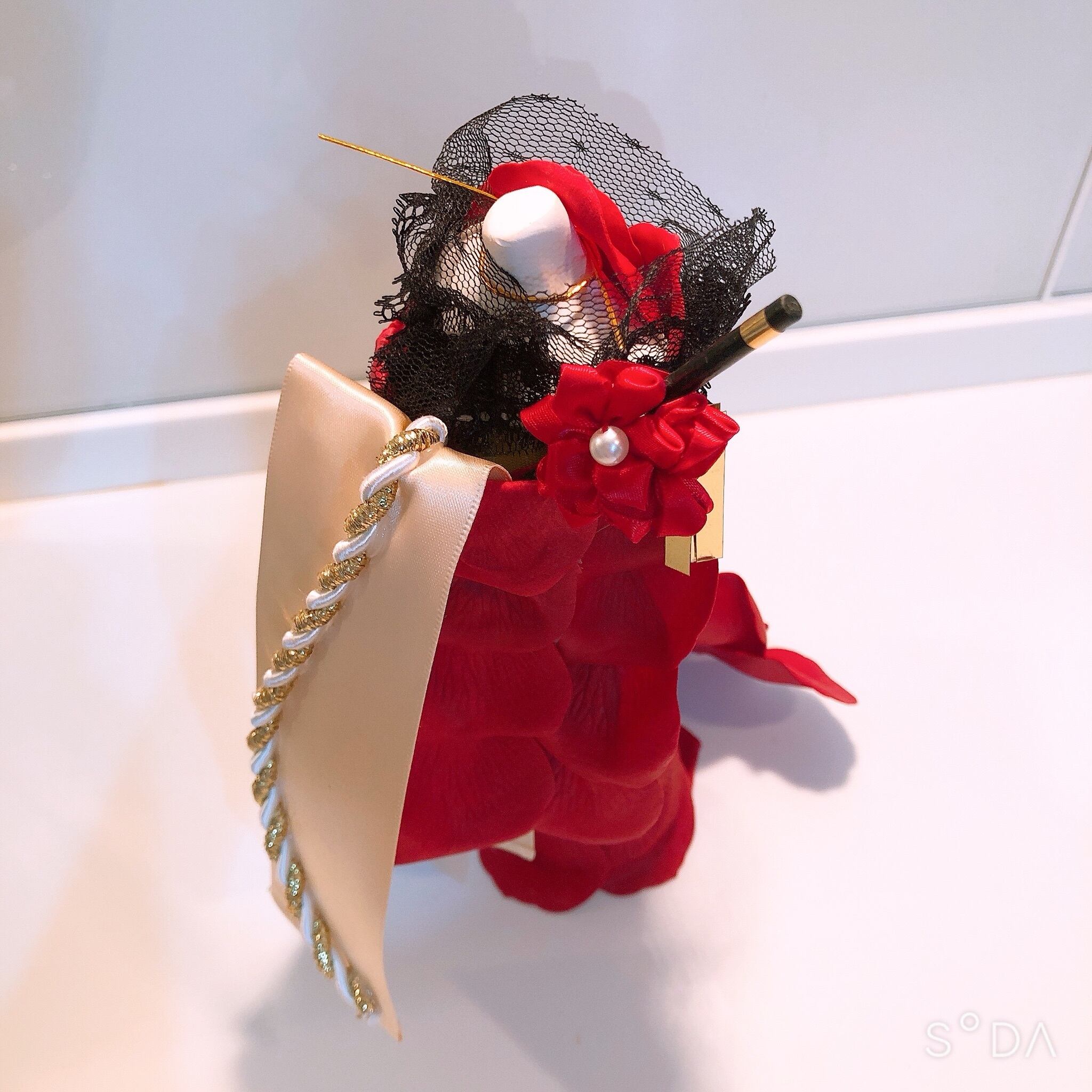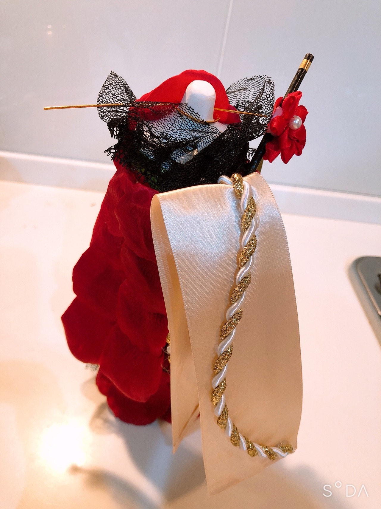 パフュームフラワーという造花を使って、赤い着物を着たドールを作りました。