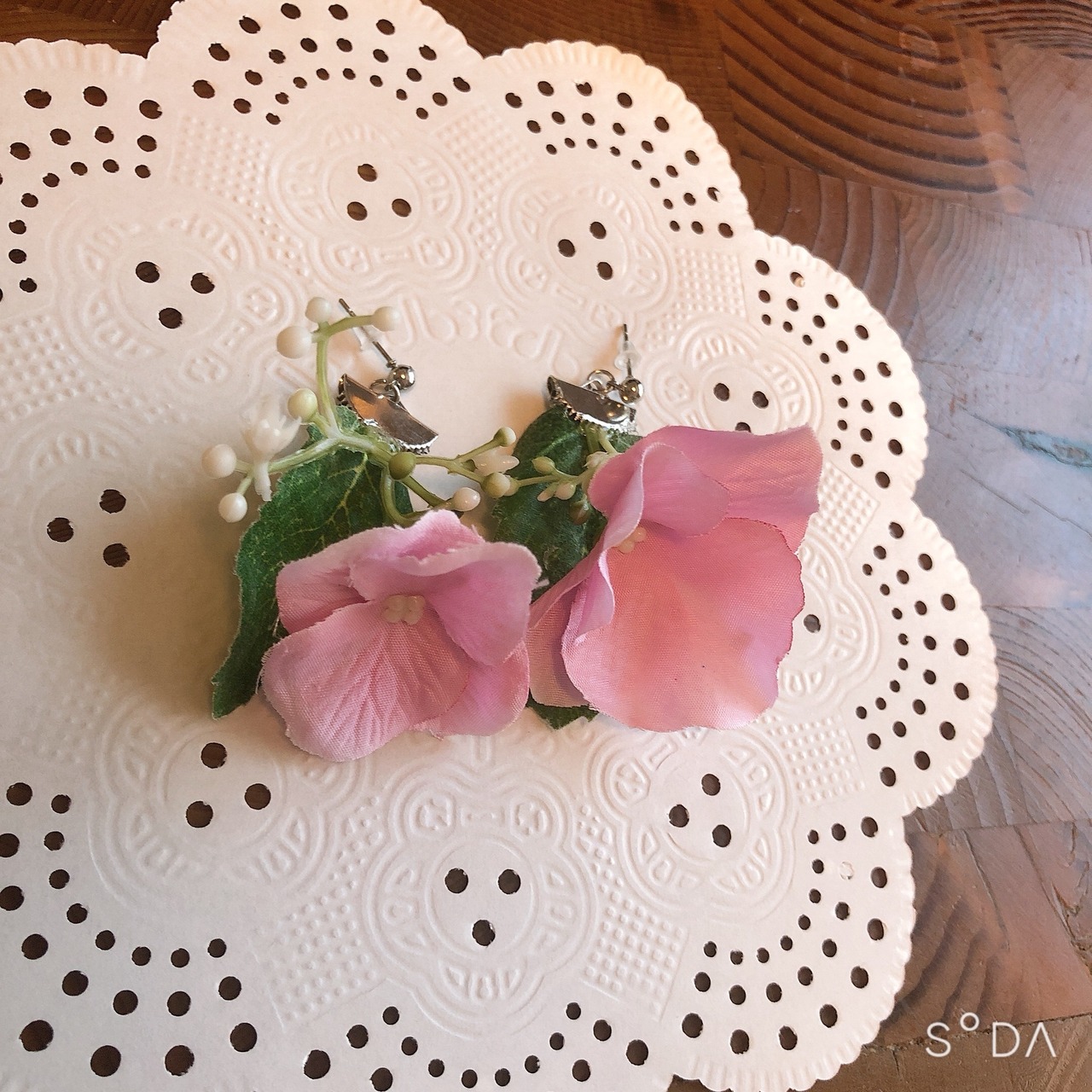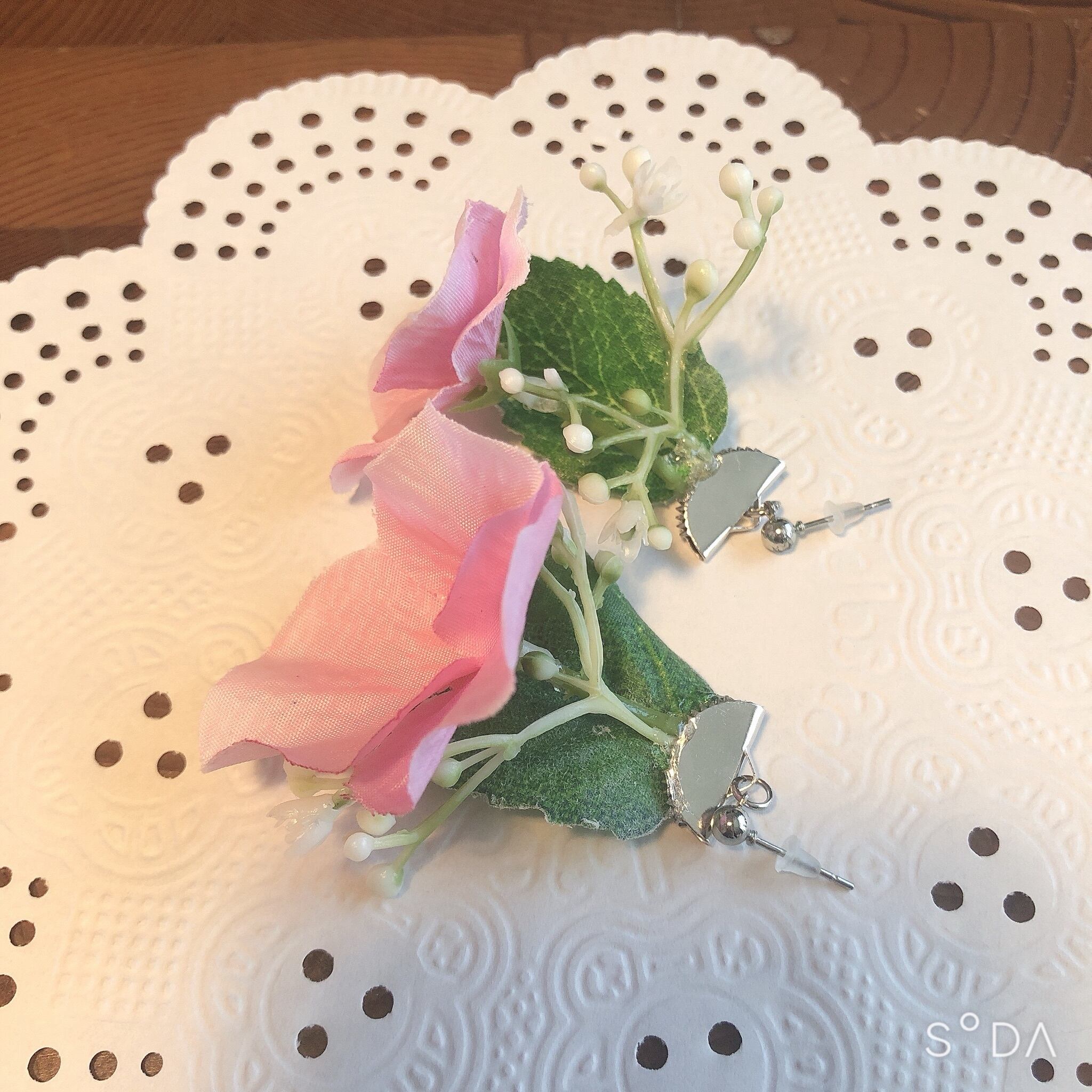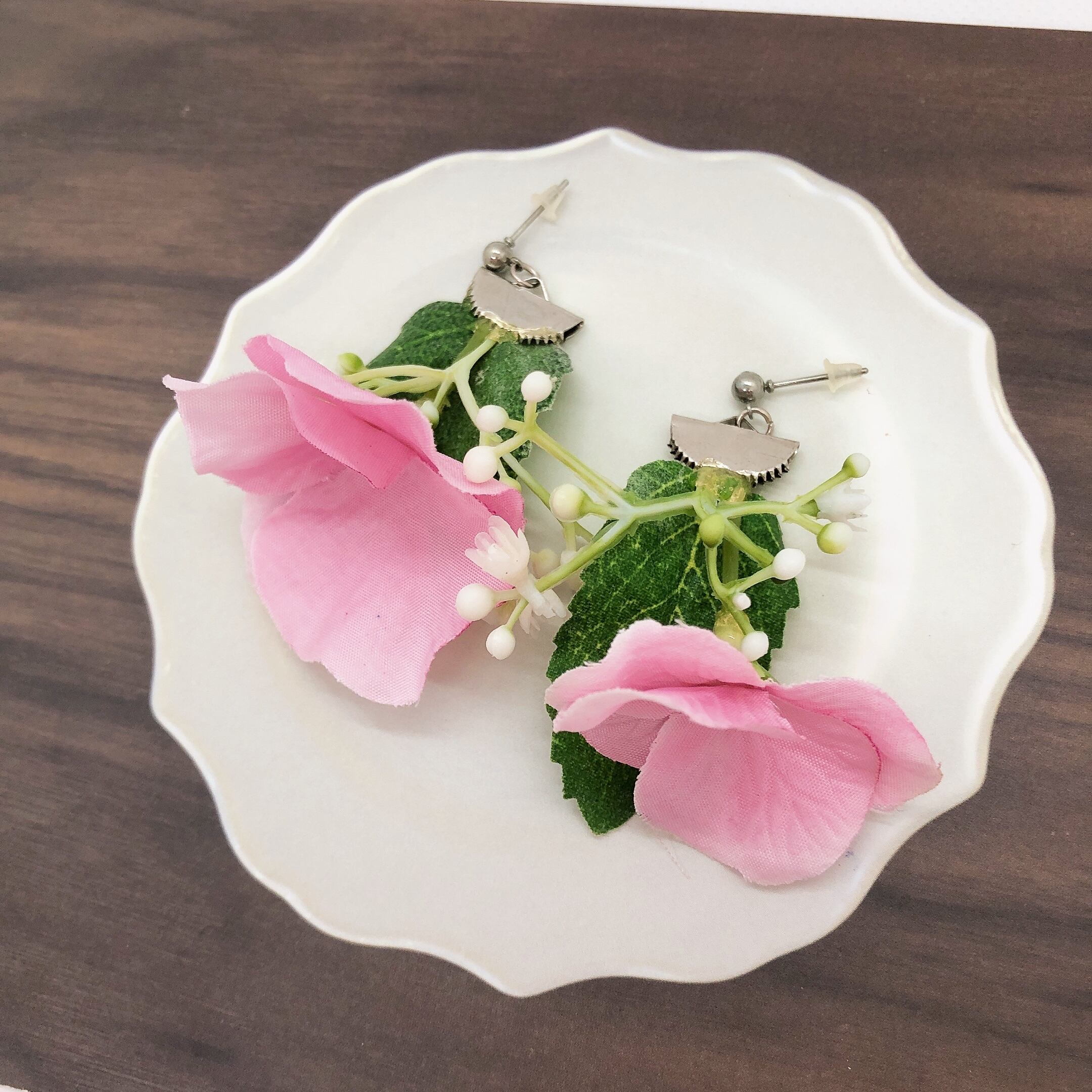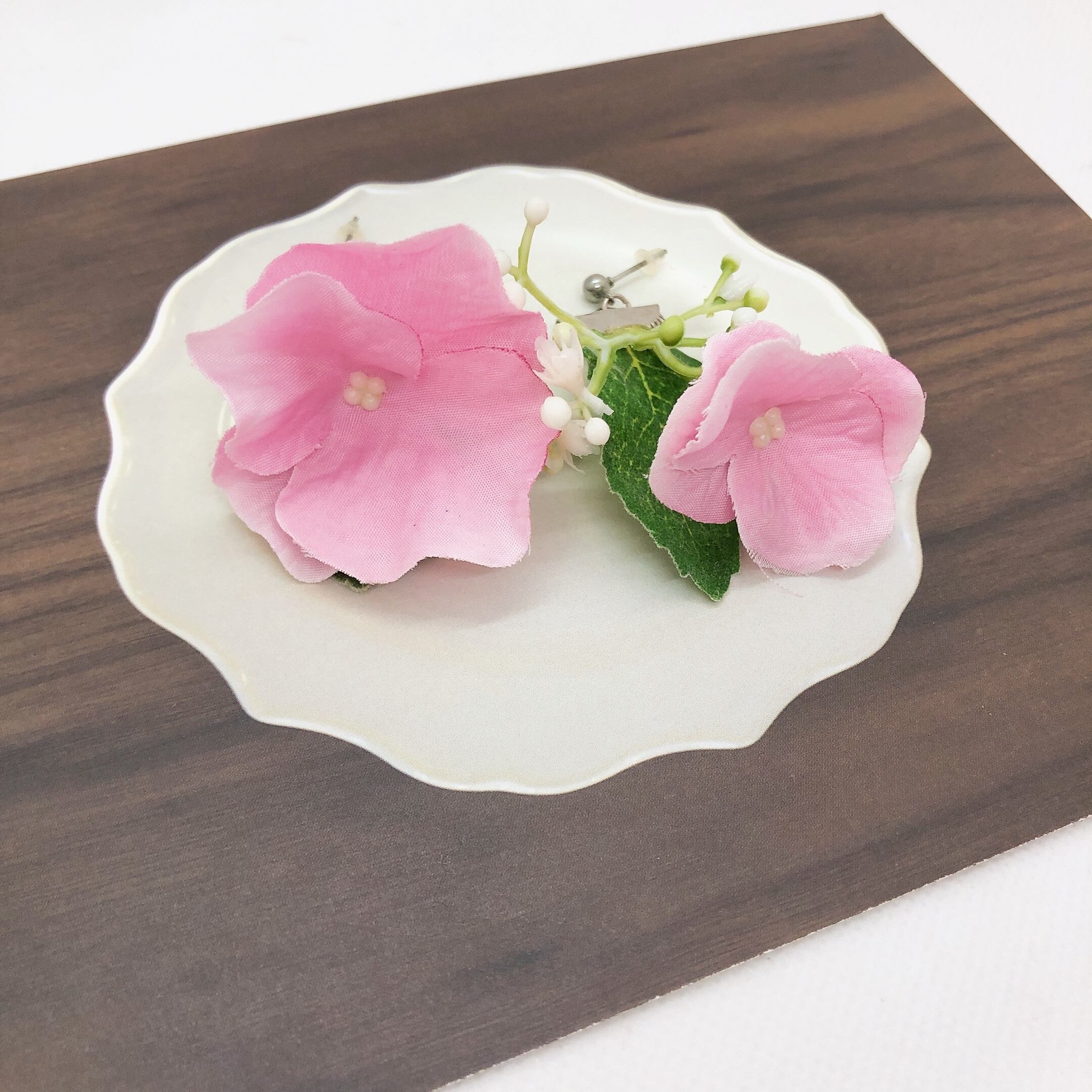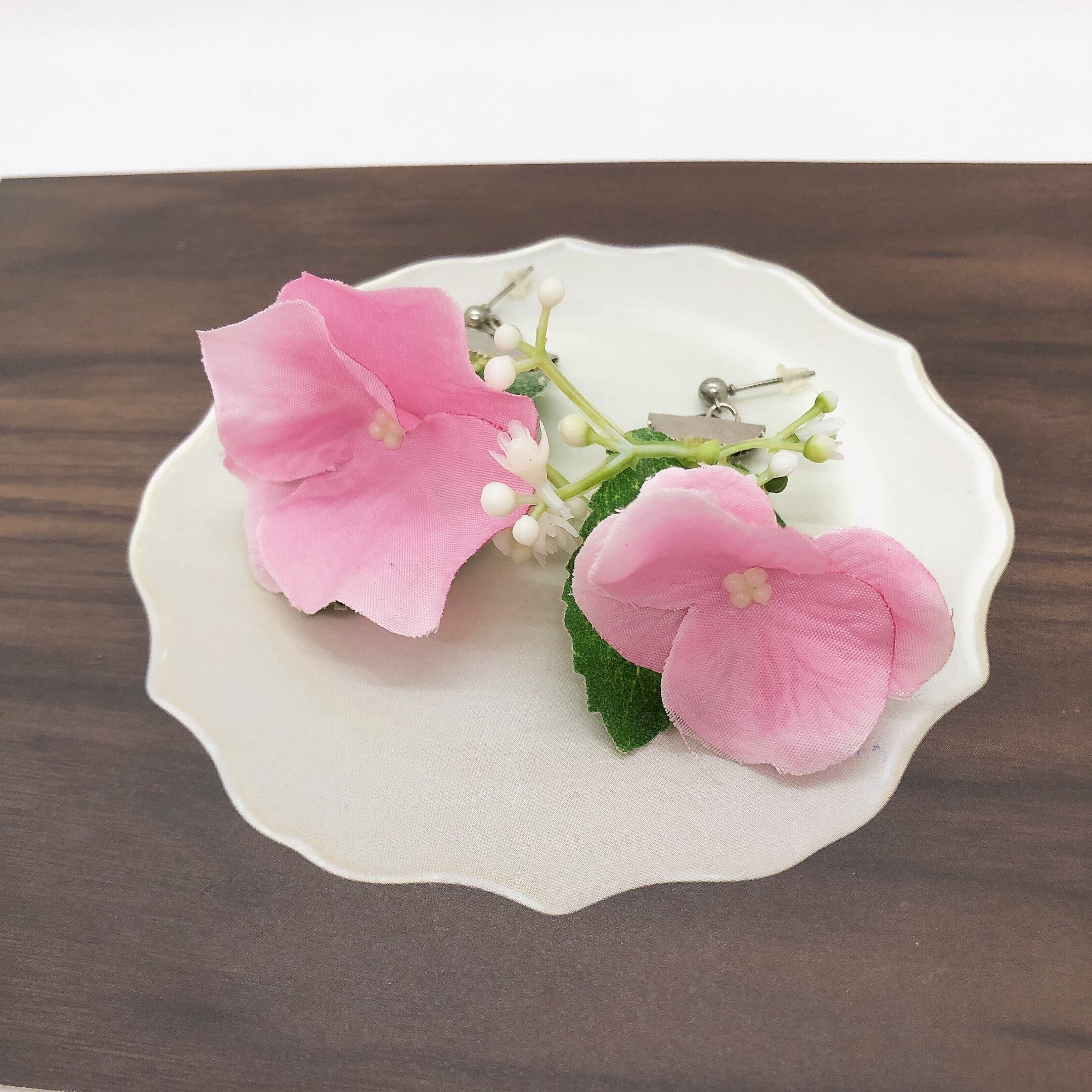 ピンクの紫陽花のアーティフィシャルフラワーを使ってピアスを作りました。