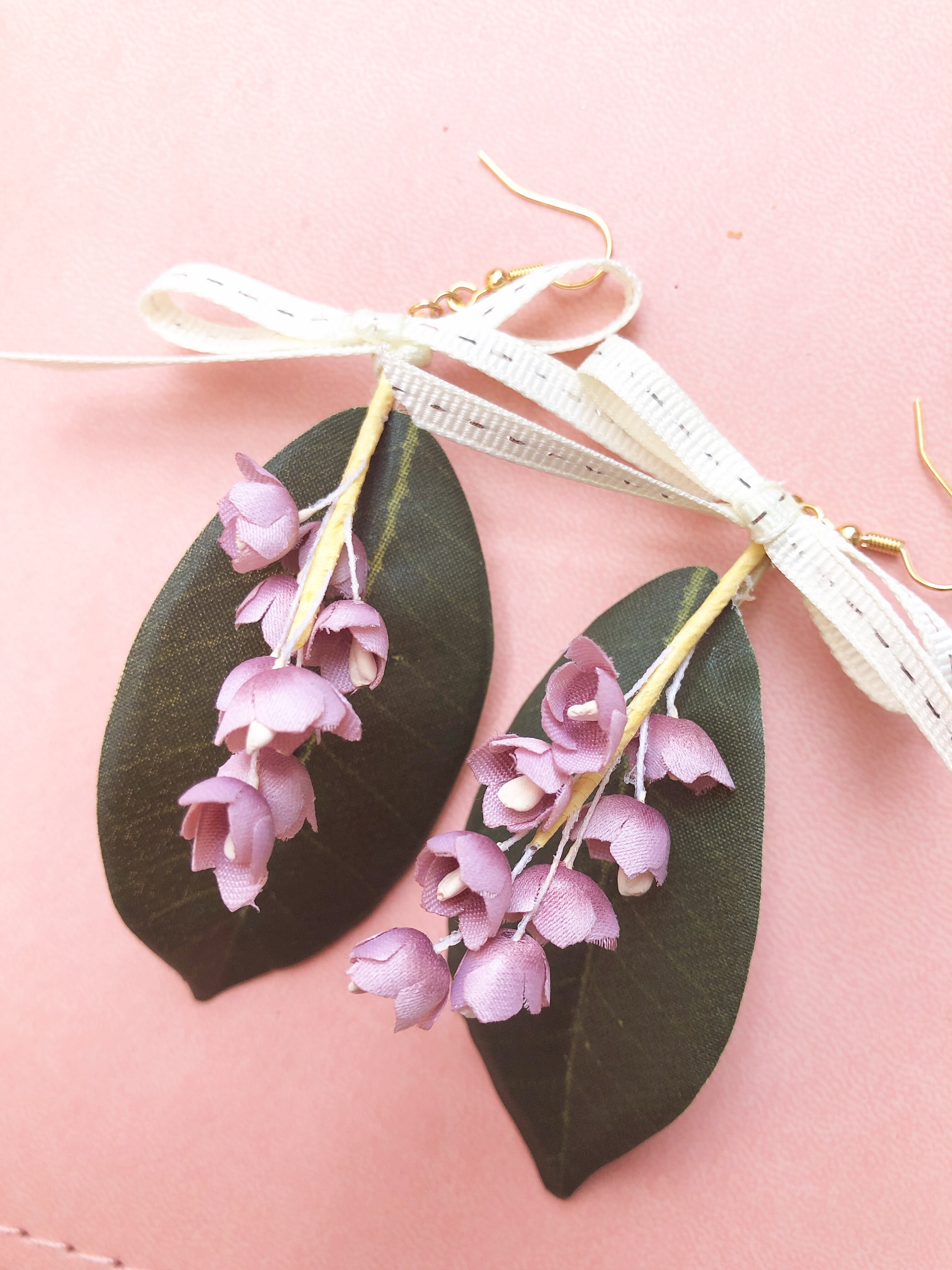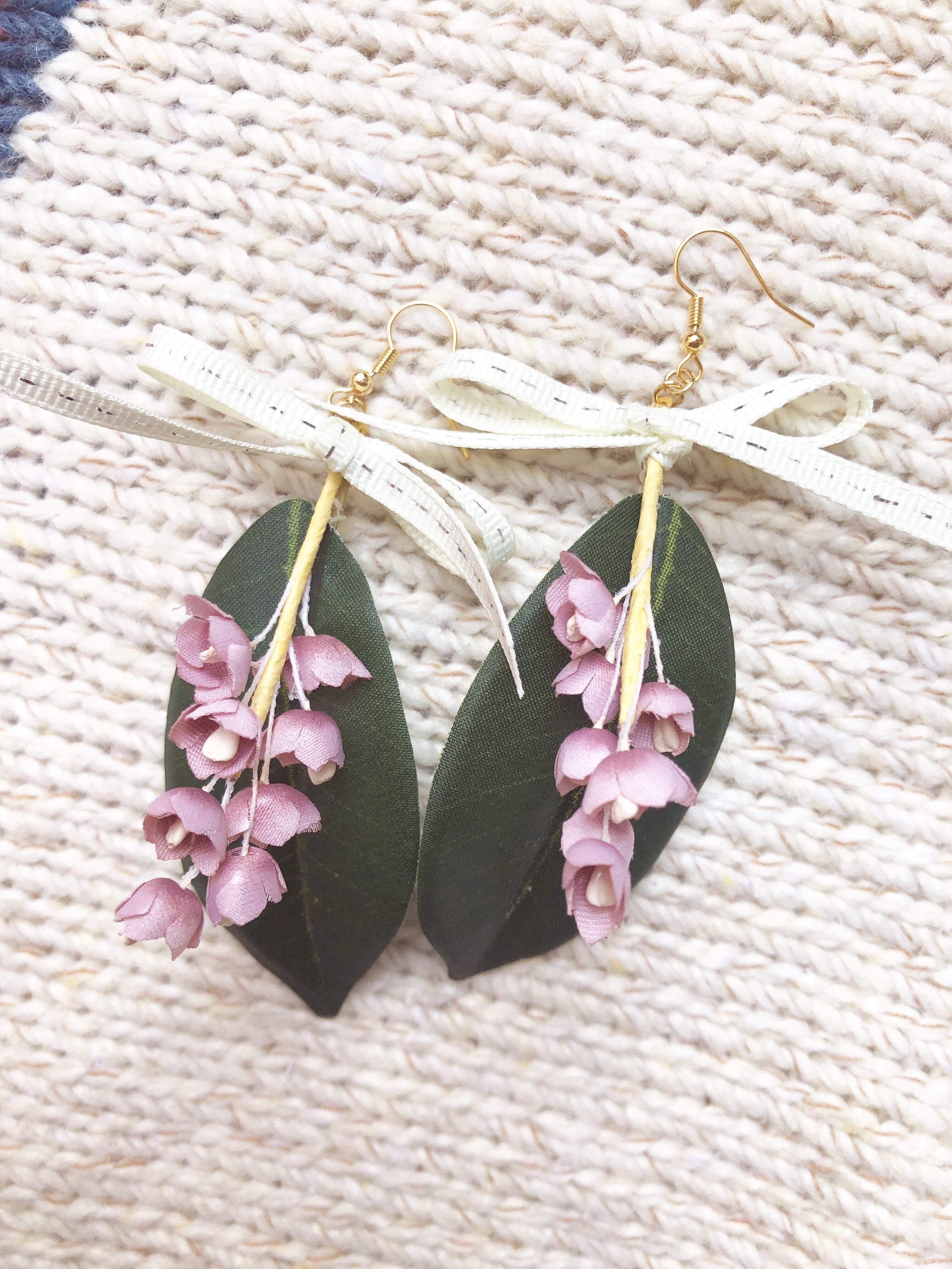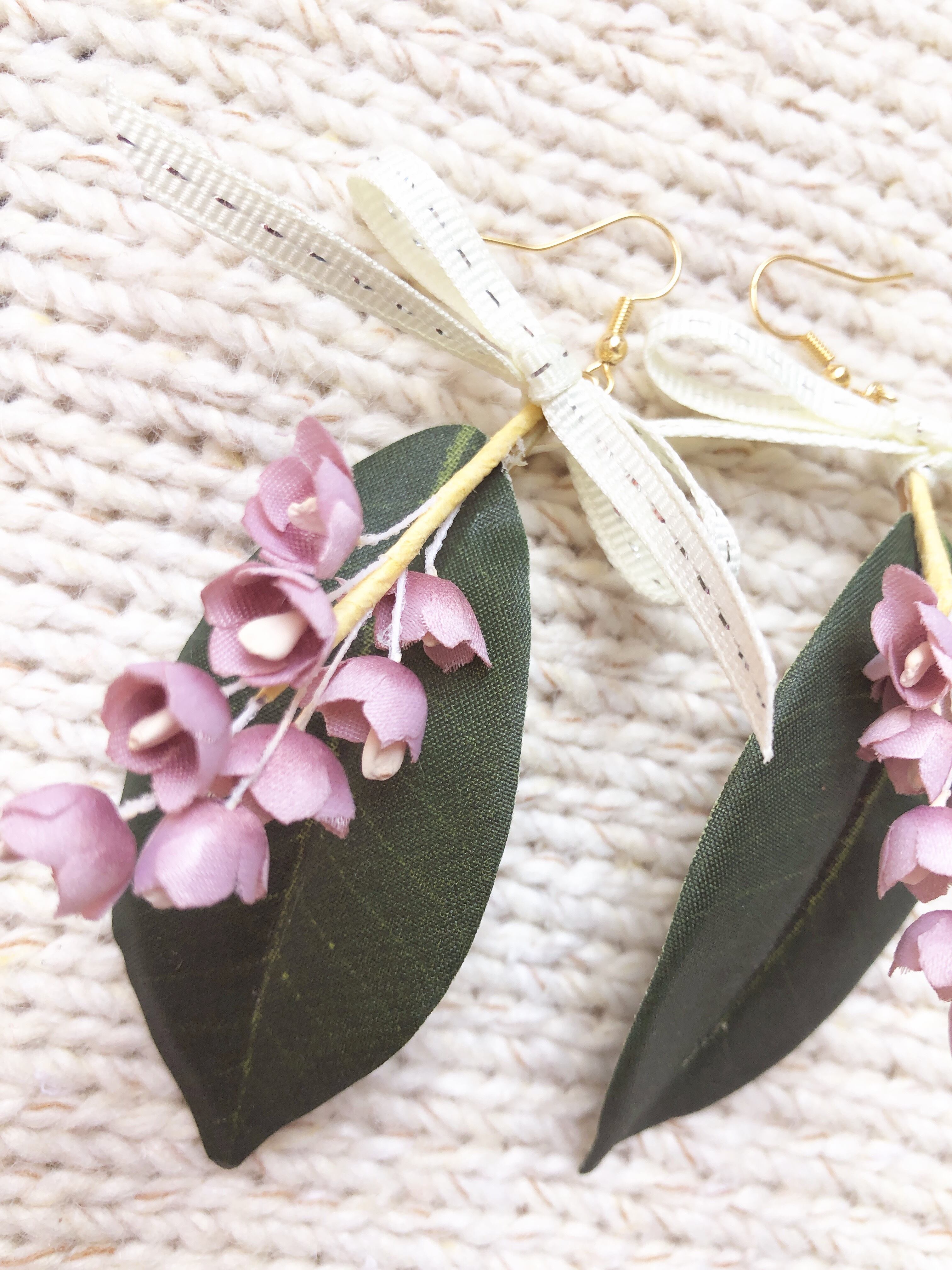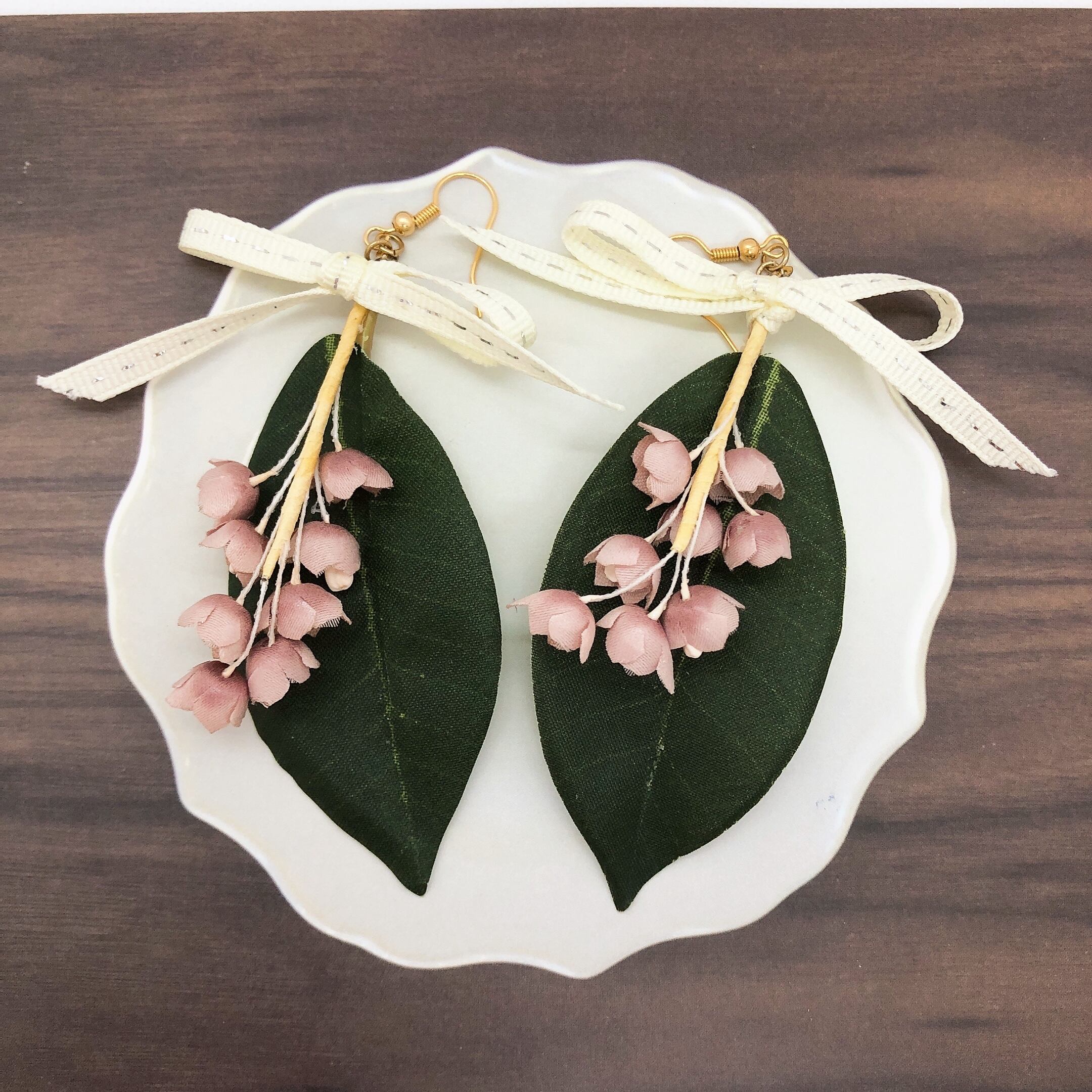造花のスズランとリーフ(榊)、白リボンを使ってピアスを作りました。スズランの色はレトロな感じの薄ピンクです。