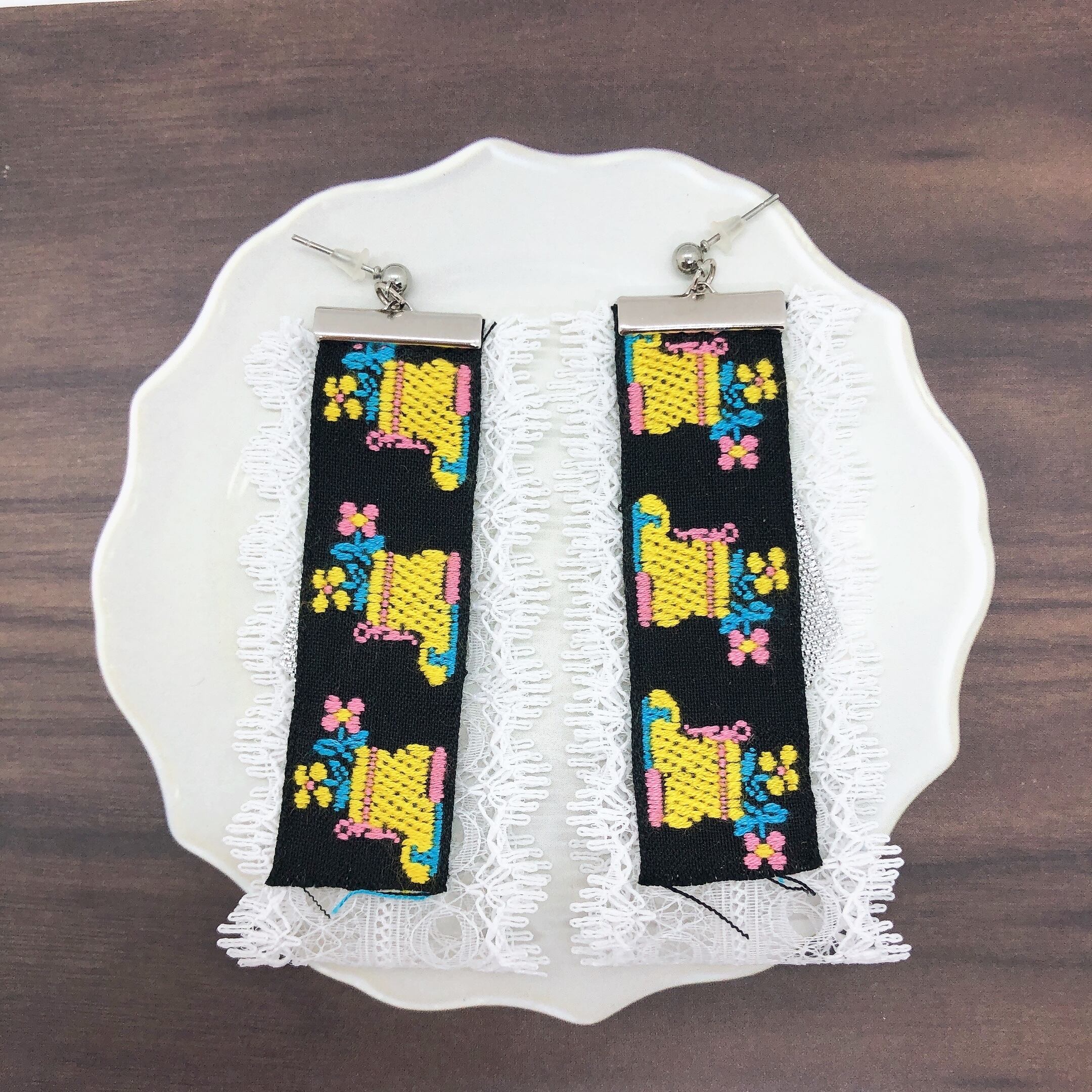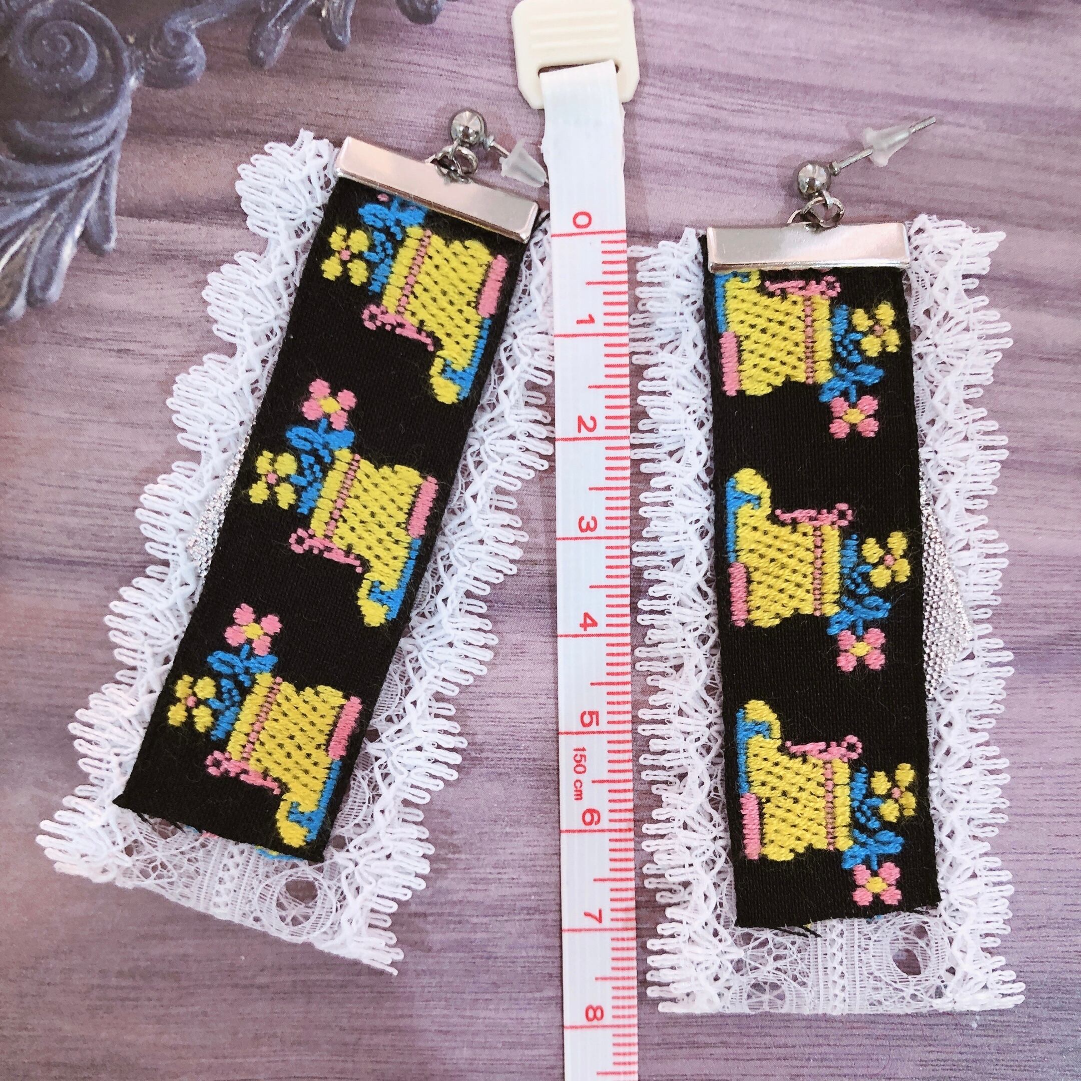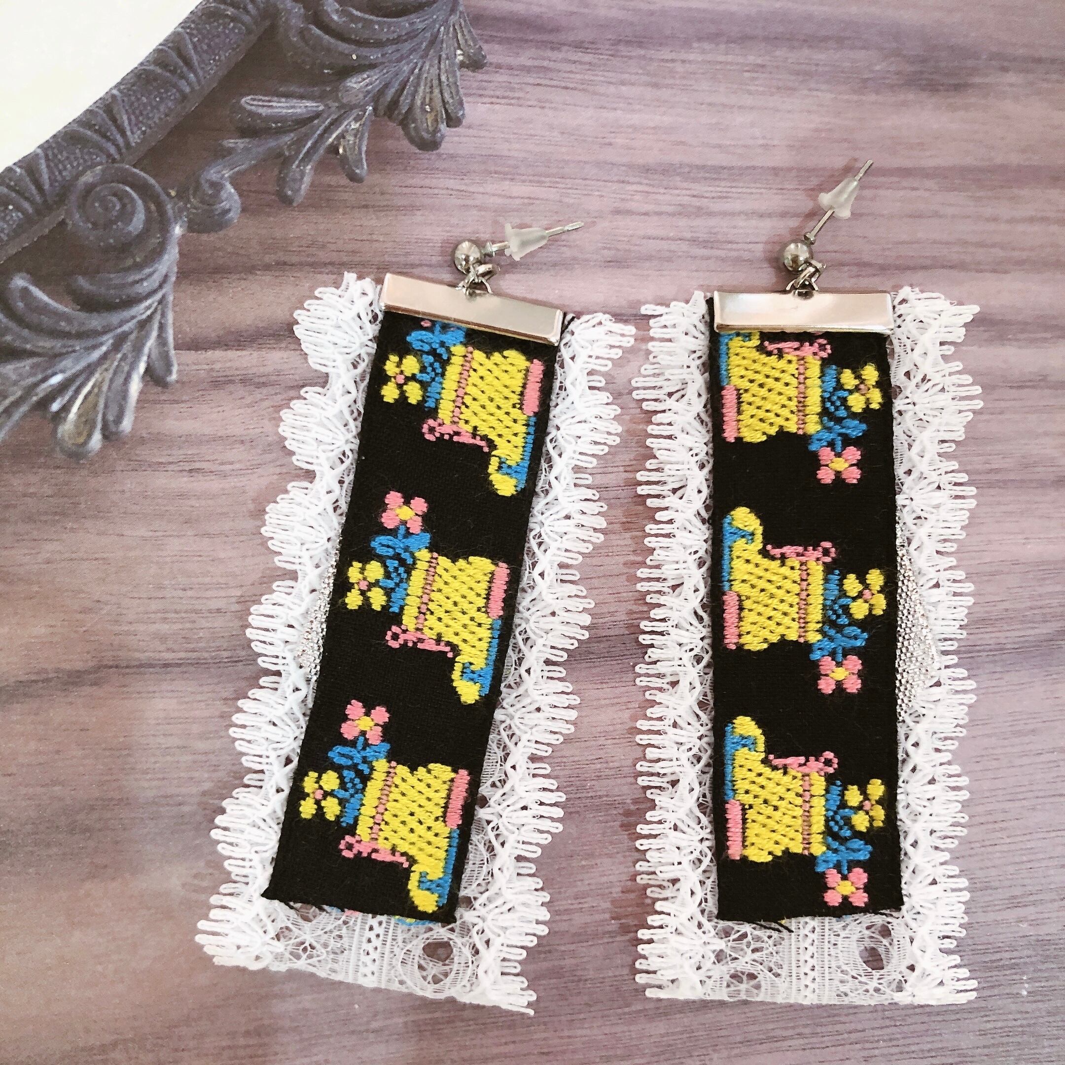 靴下のチロリアンテープとレース・リボンを組み合わせたピアスです。