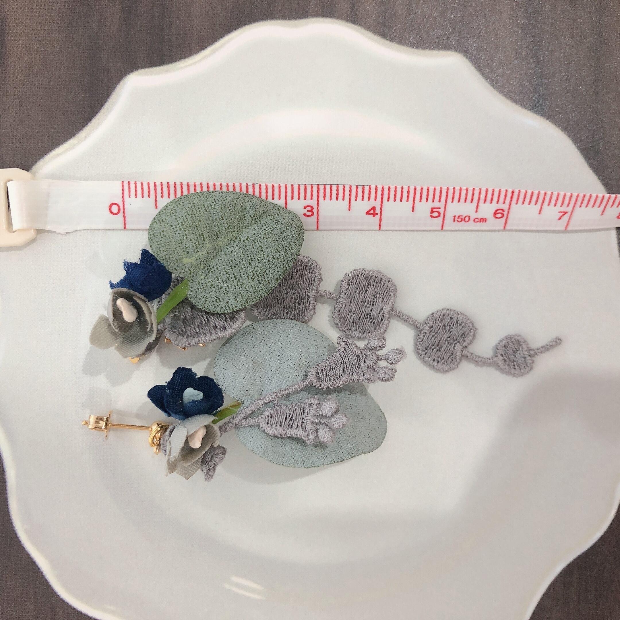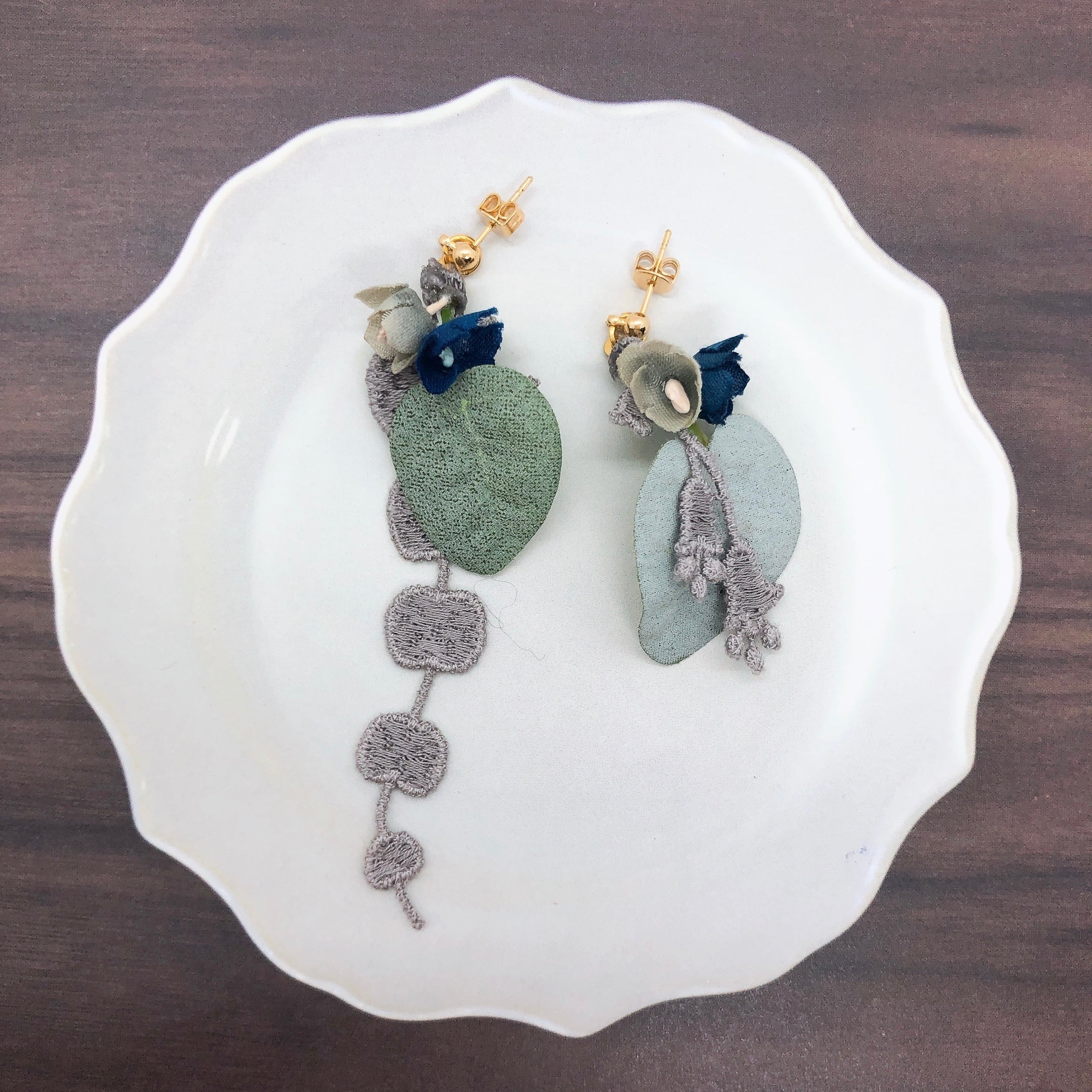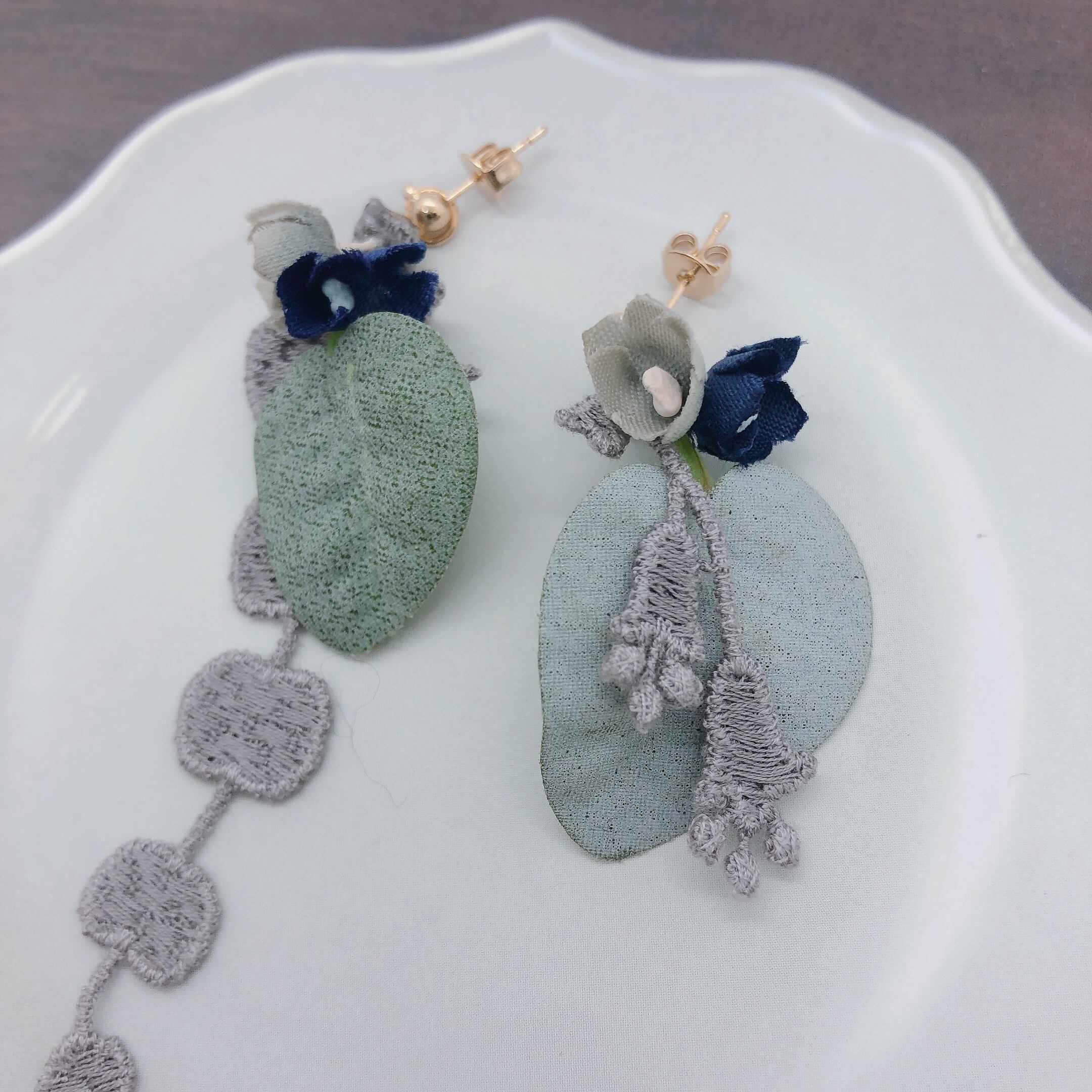 ピアス イヤリング 昭和レトロ レトロポップ アンティーク ヴィンテージ 布花 すずらん スズラン 鈴蘭 灰色 紺色 グレー ネイビー アシンメトリー リーフ 葉っぱ