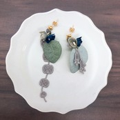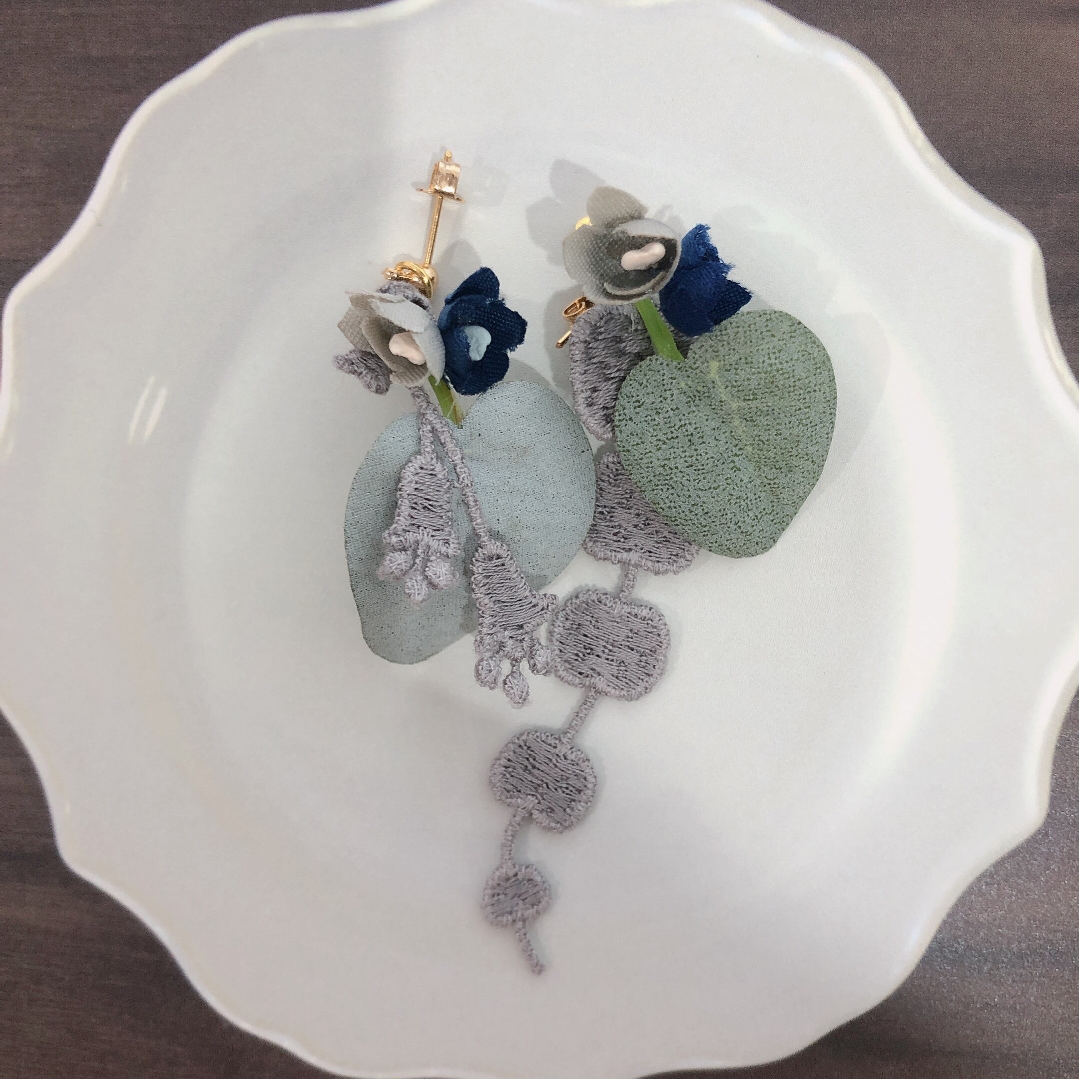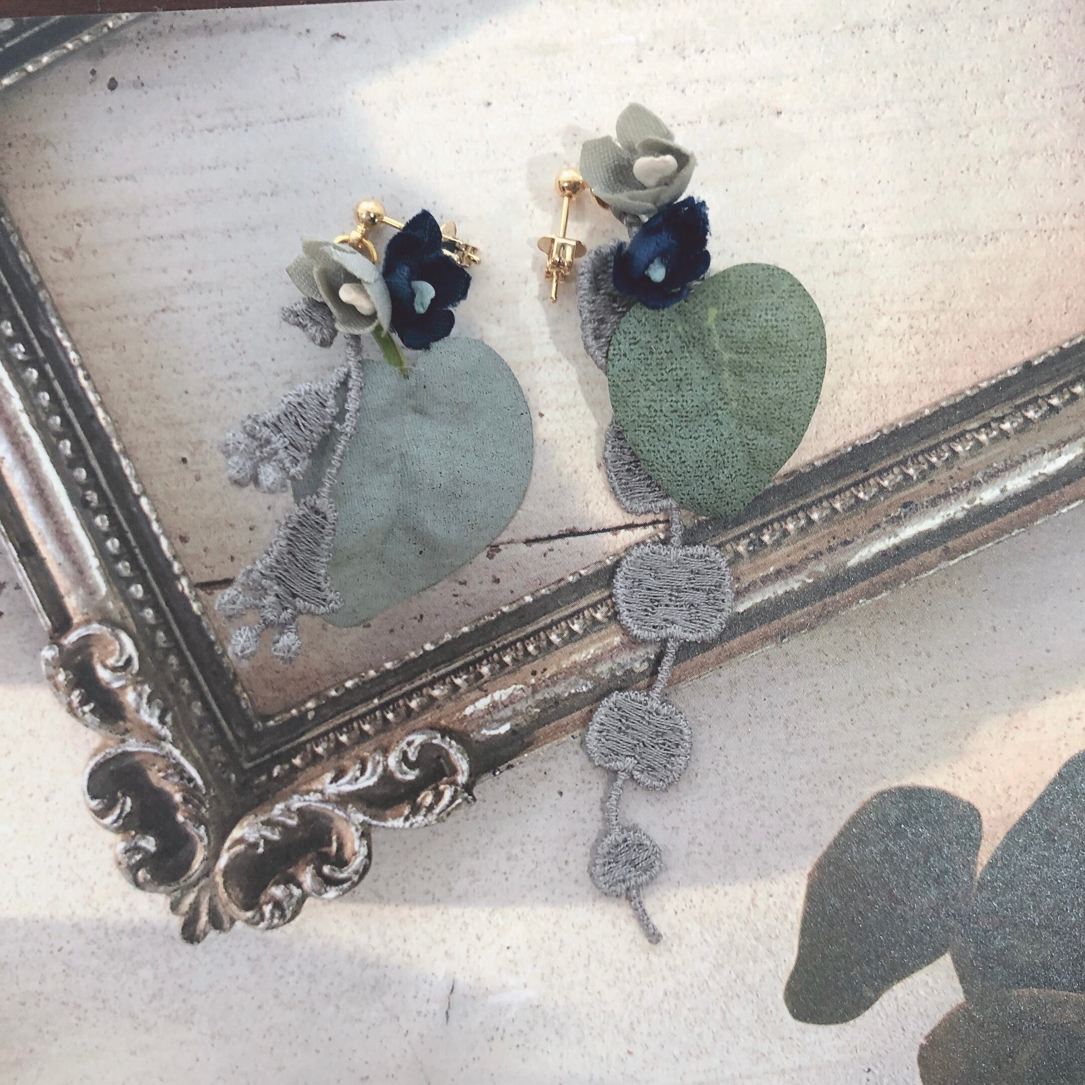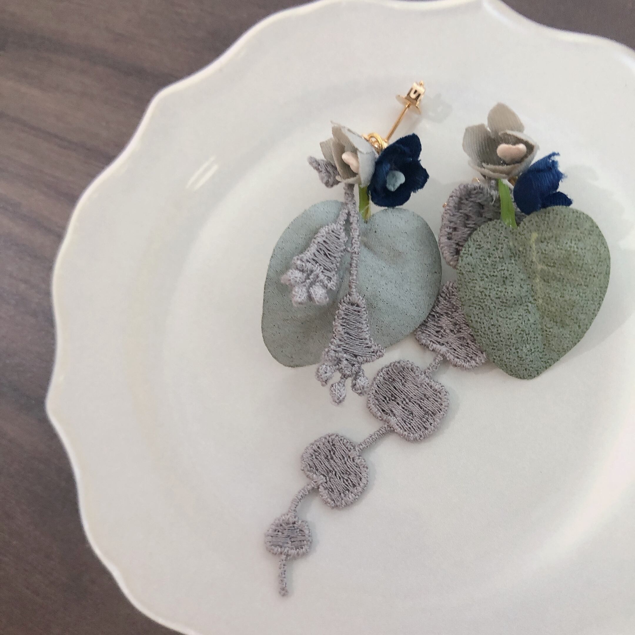 布花のすずらん・アーティフィシャルのリーフを使って、ピアスを作りました。灰色と紺色の組み合わせ。