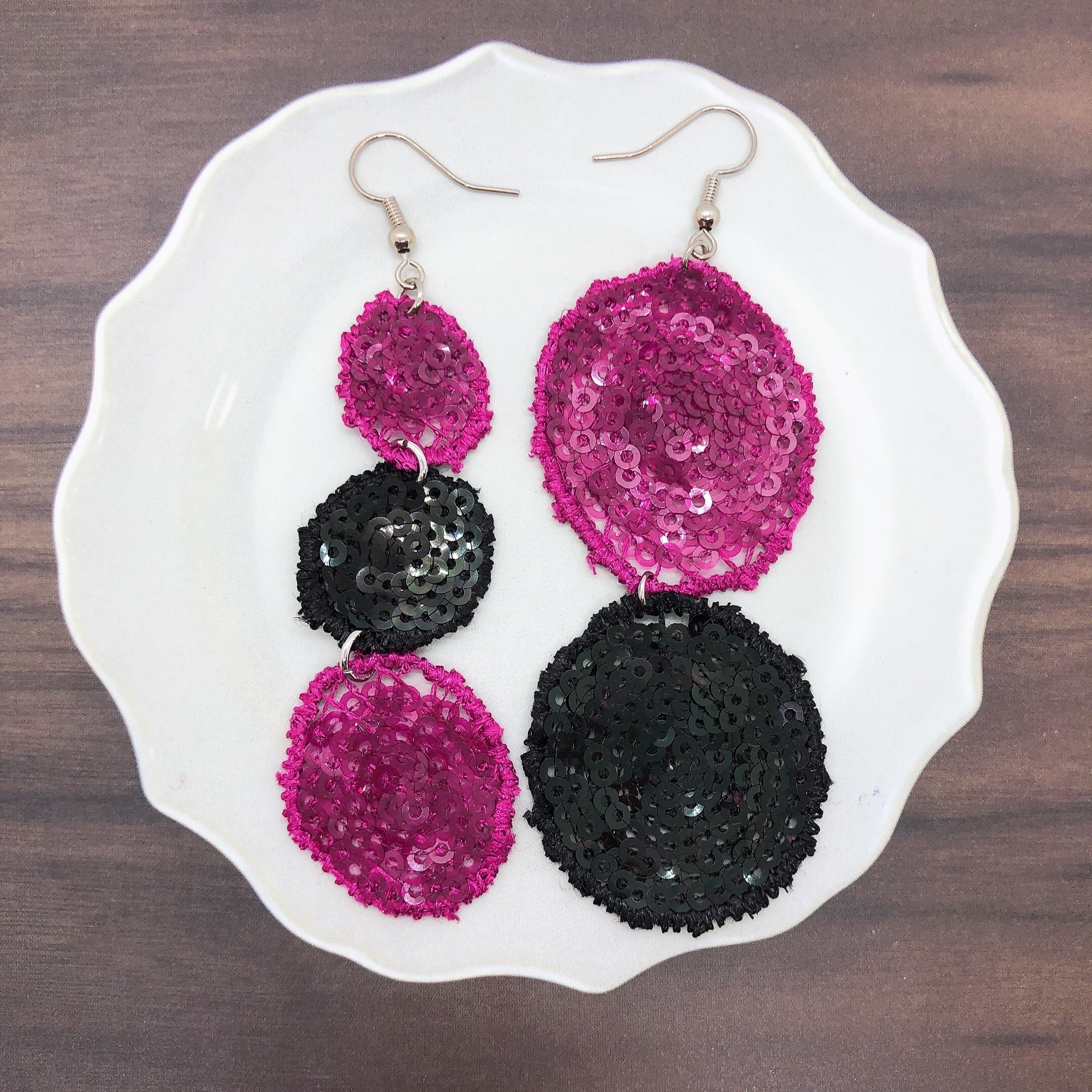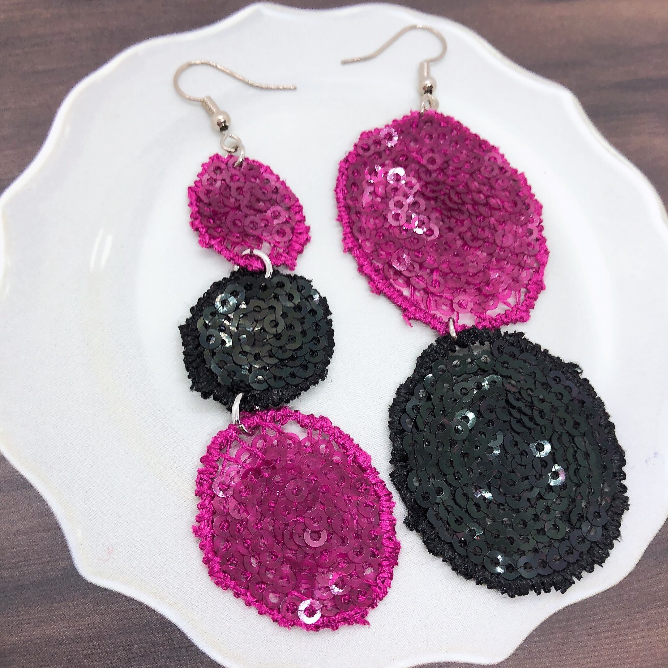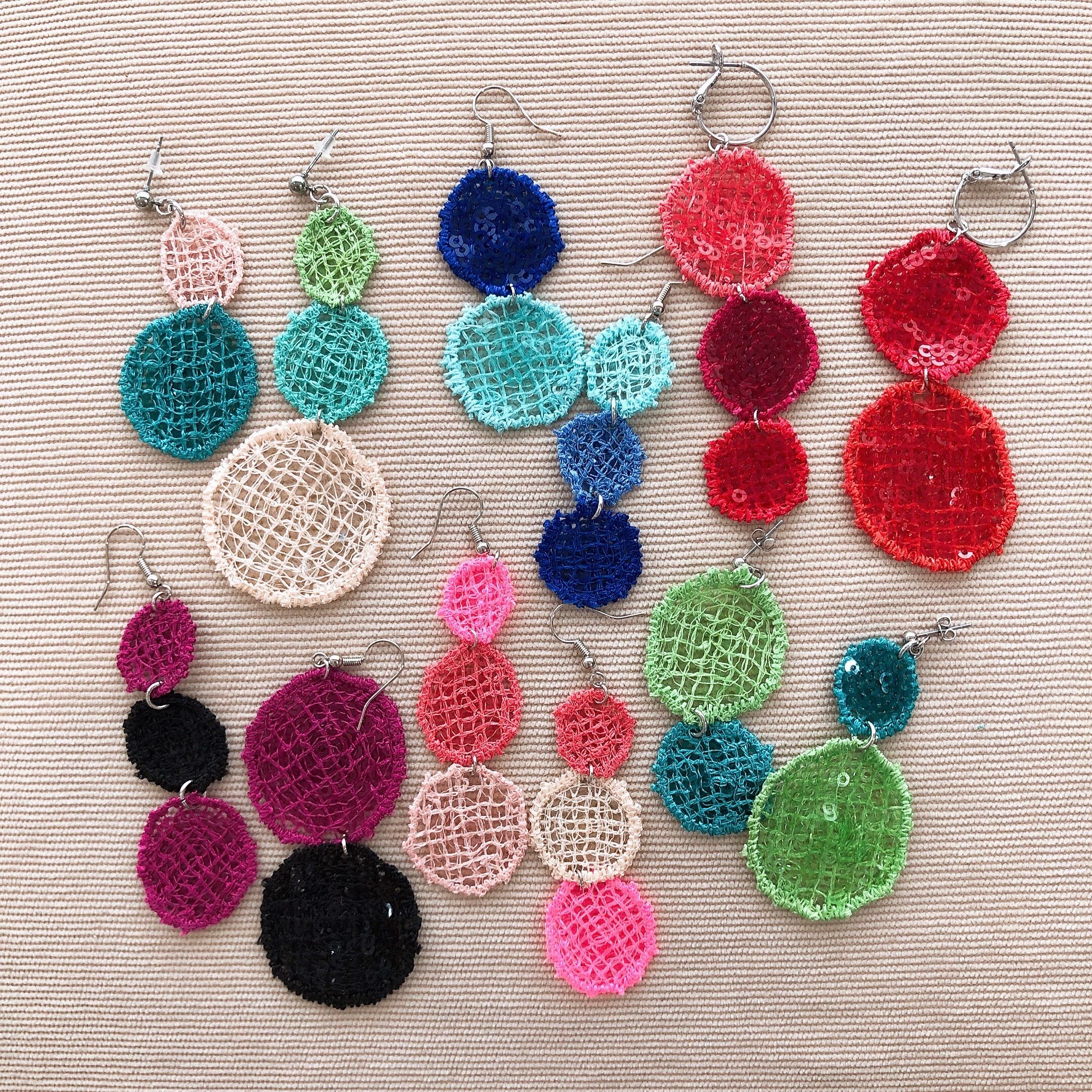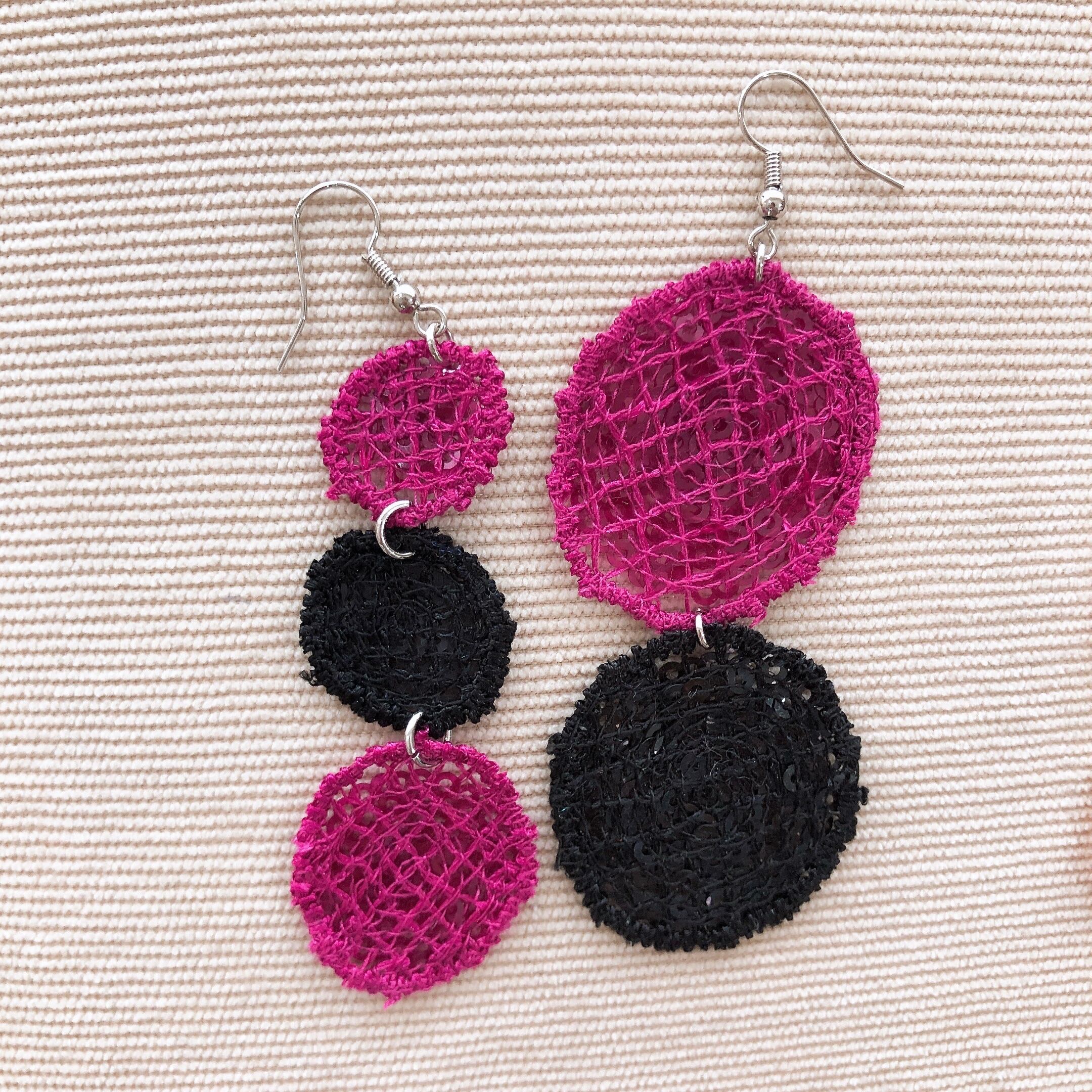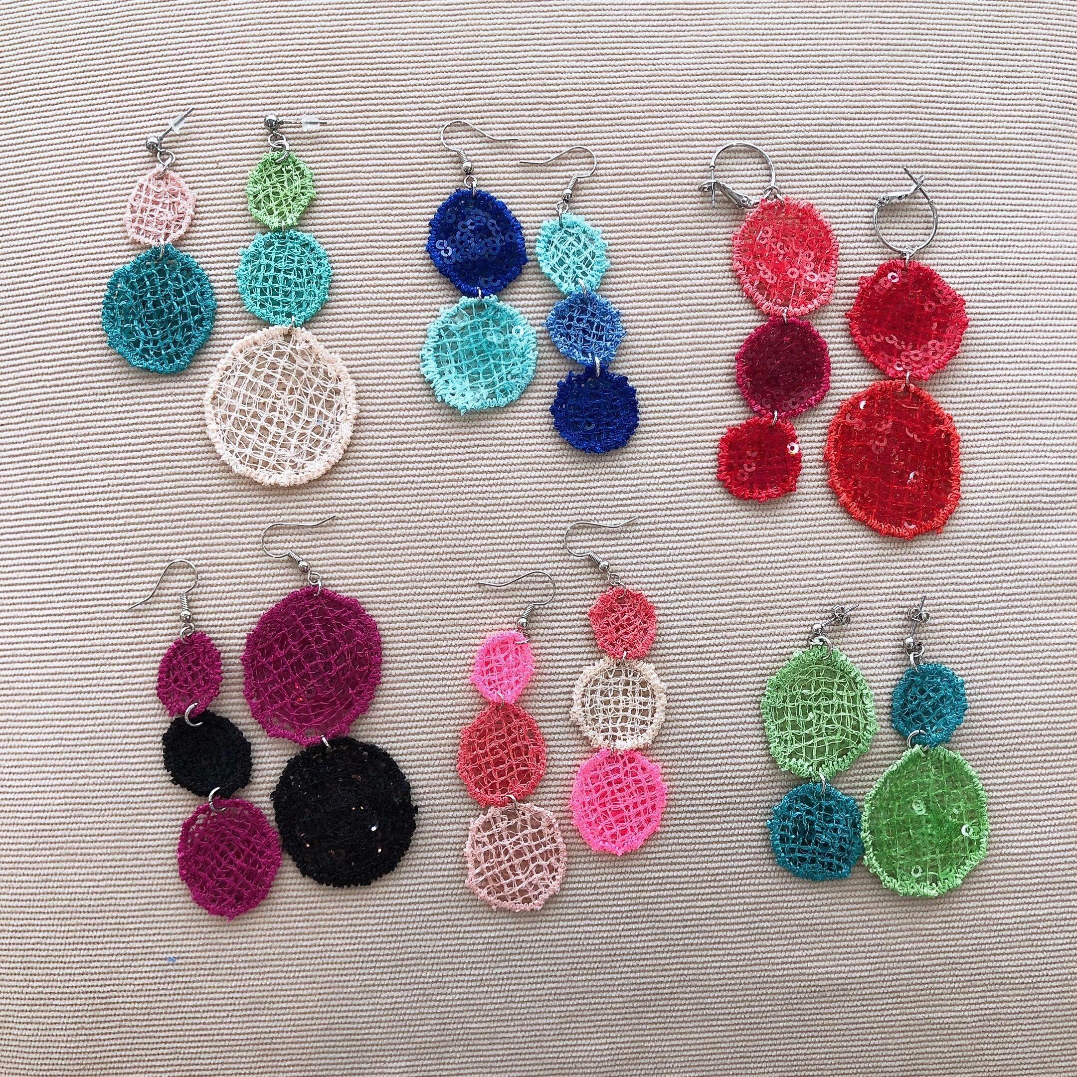 スパンコールを使った丸いモチーフでピアスを作りました。
