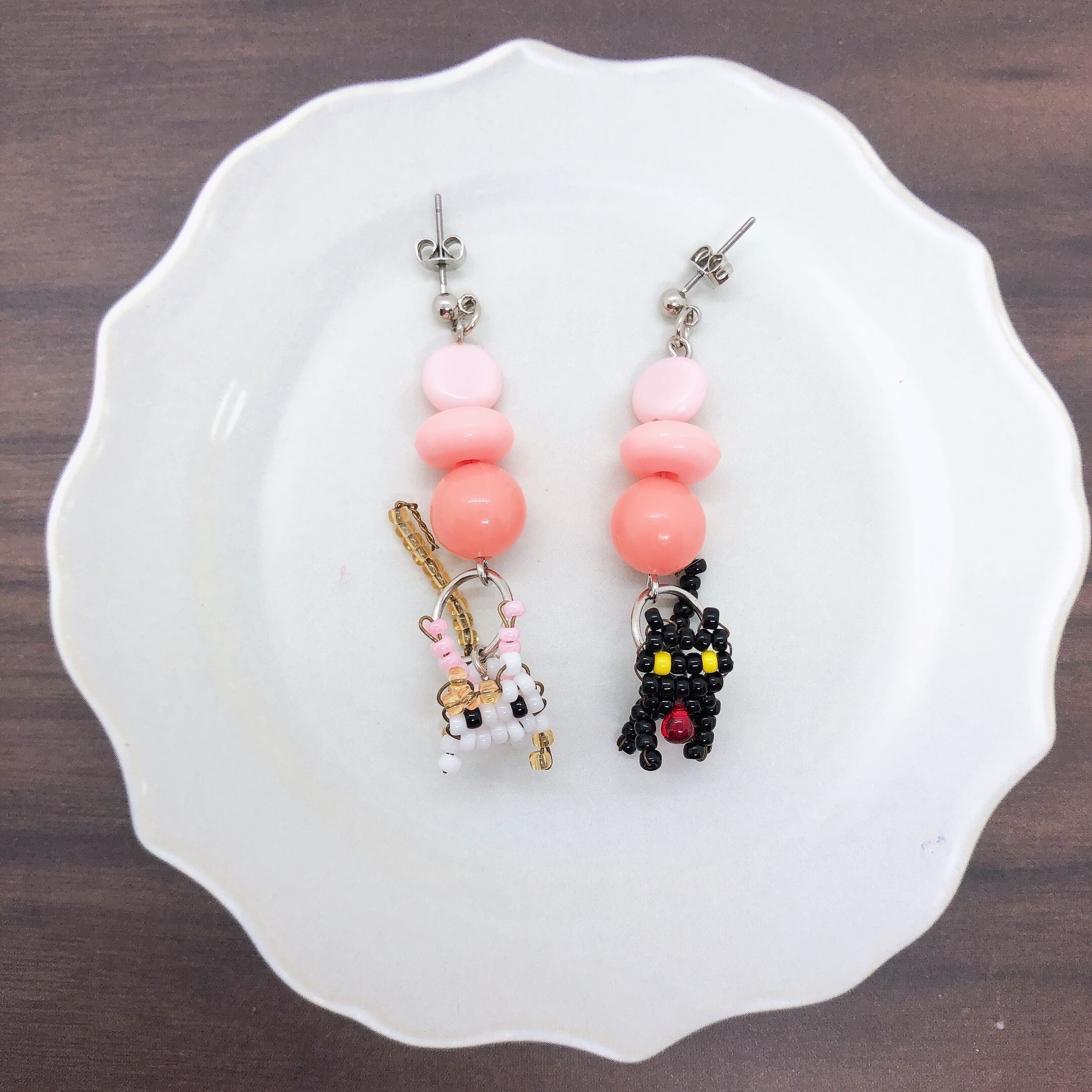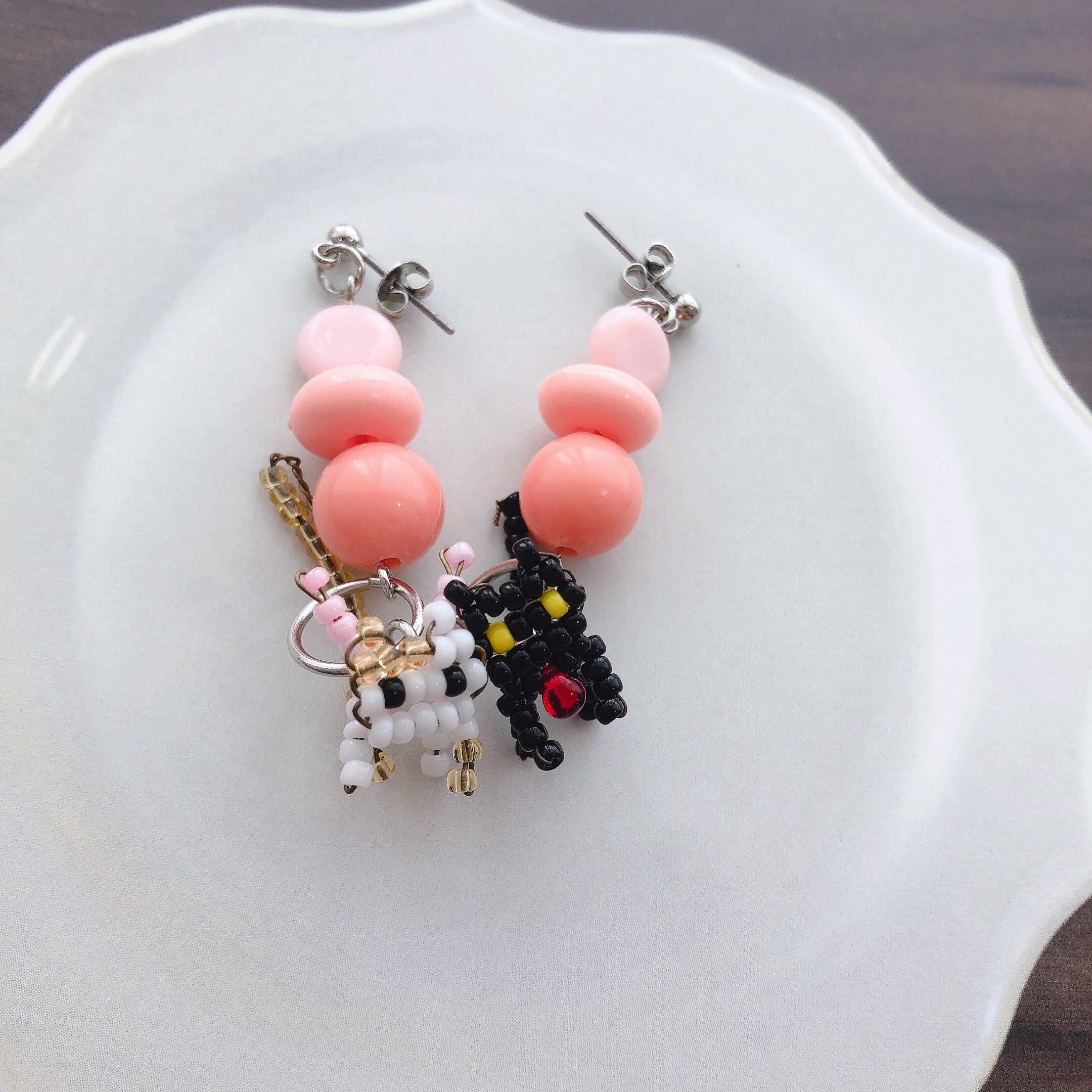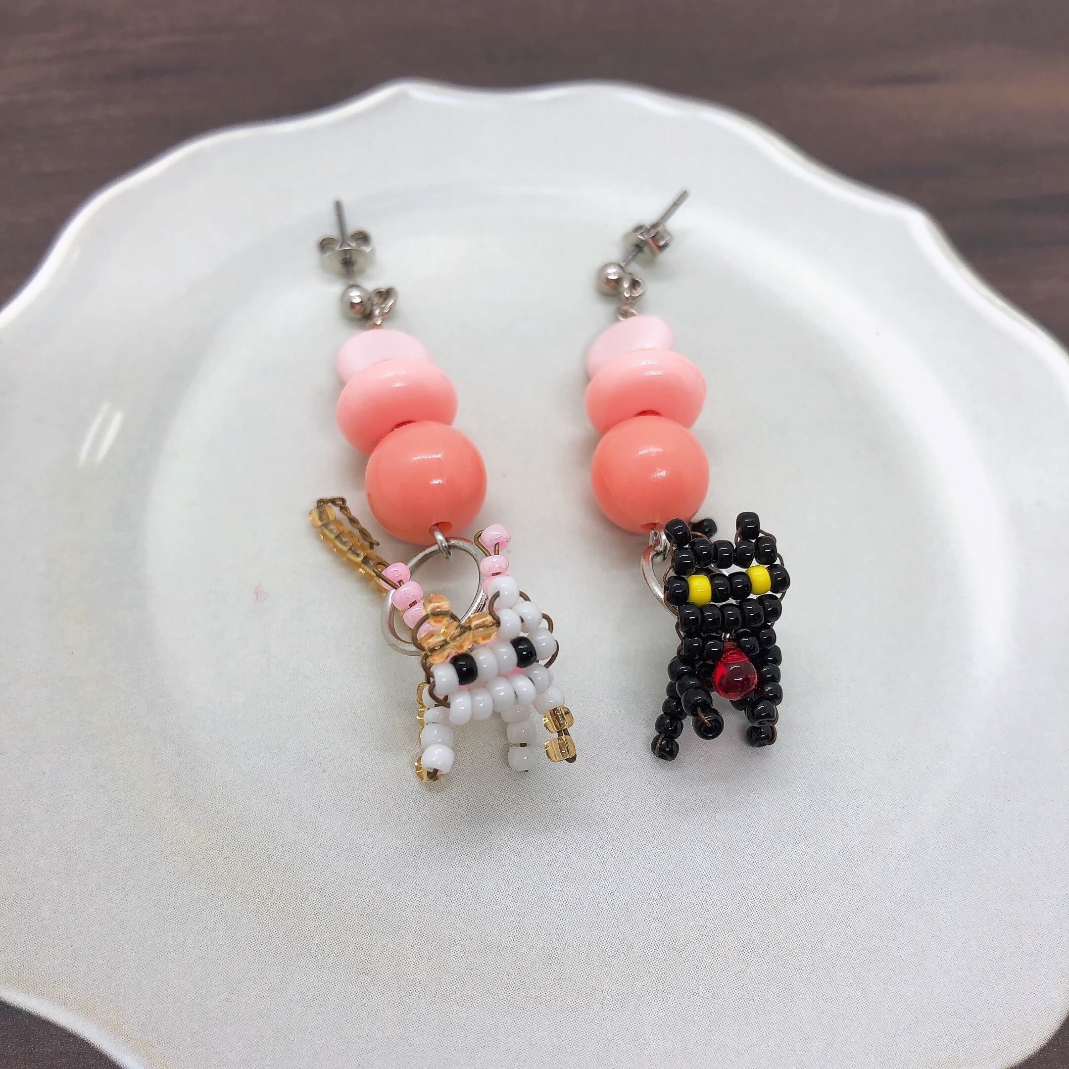 ピアス イヤリング 昭和レトロ レトロポップ アンティーク ヴィンテージ アシンメトリー 黒猫 三毛猫 白猫 鈴 りぼん ビーズ