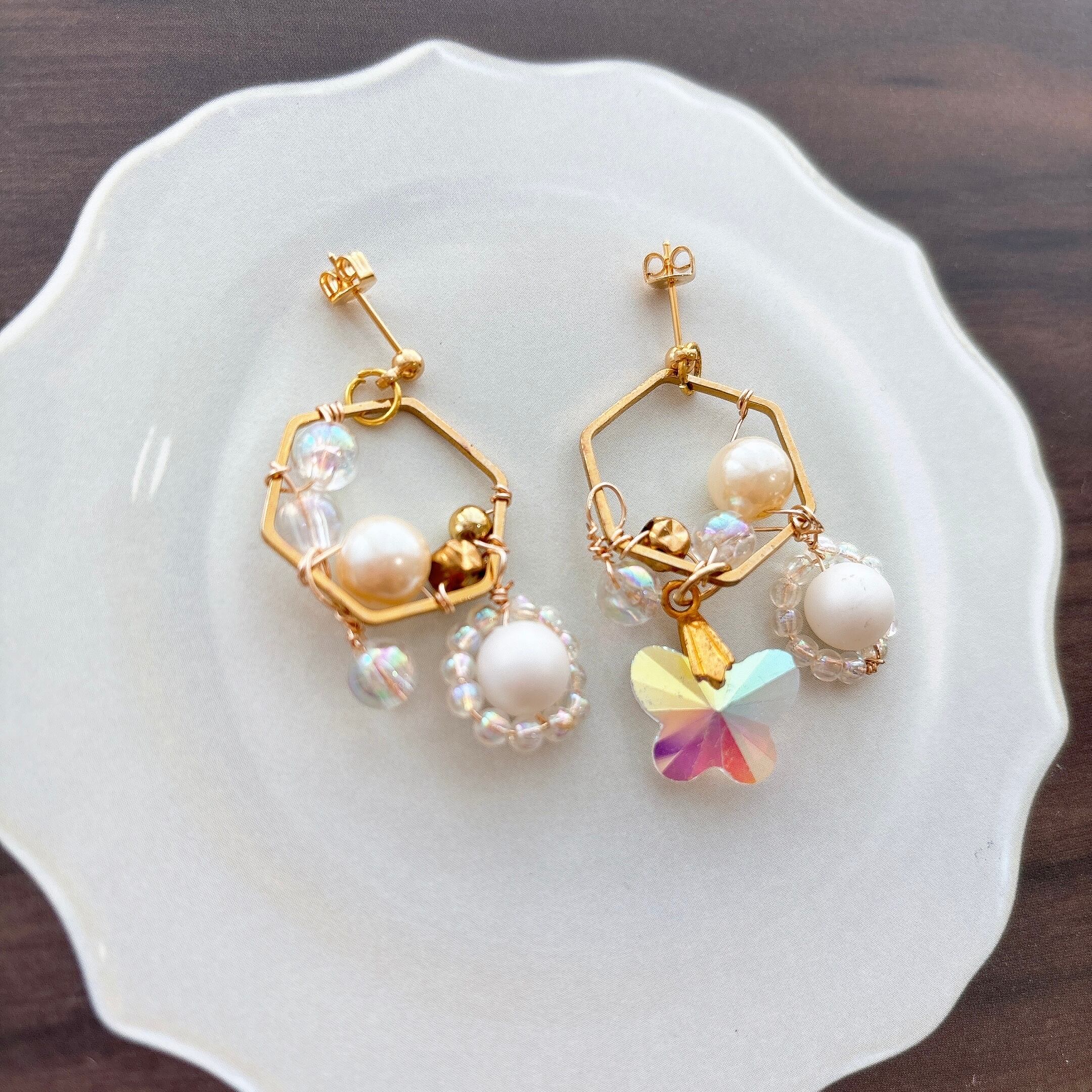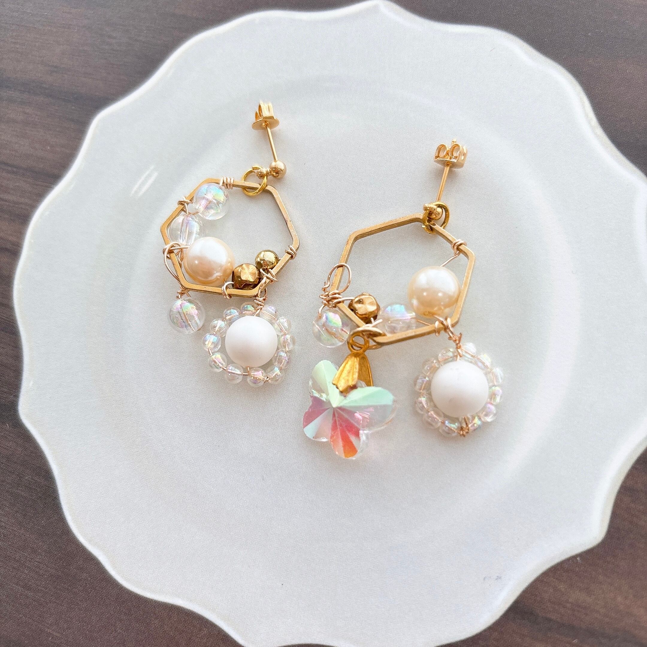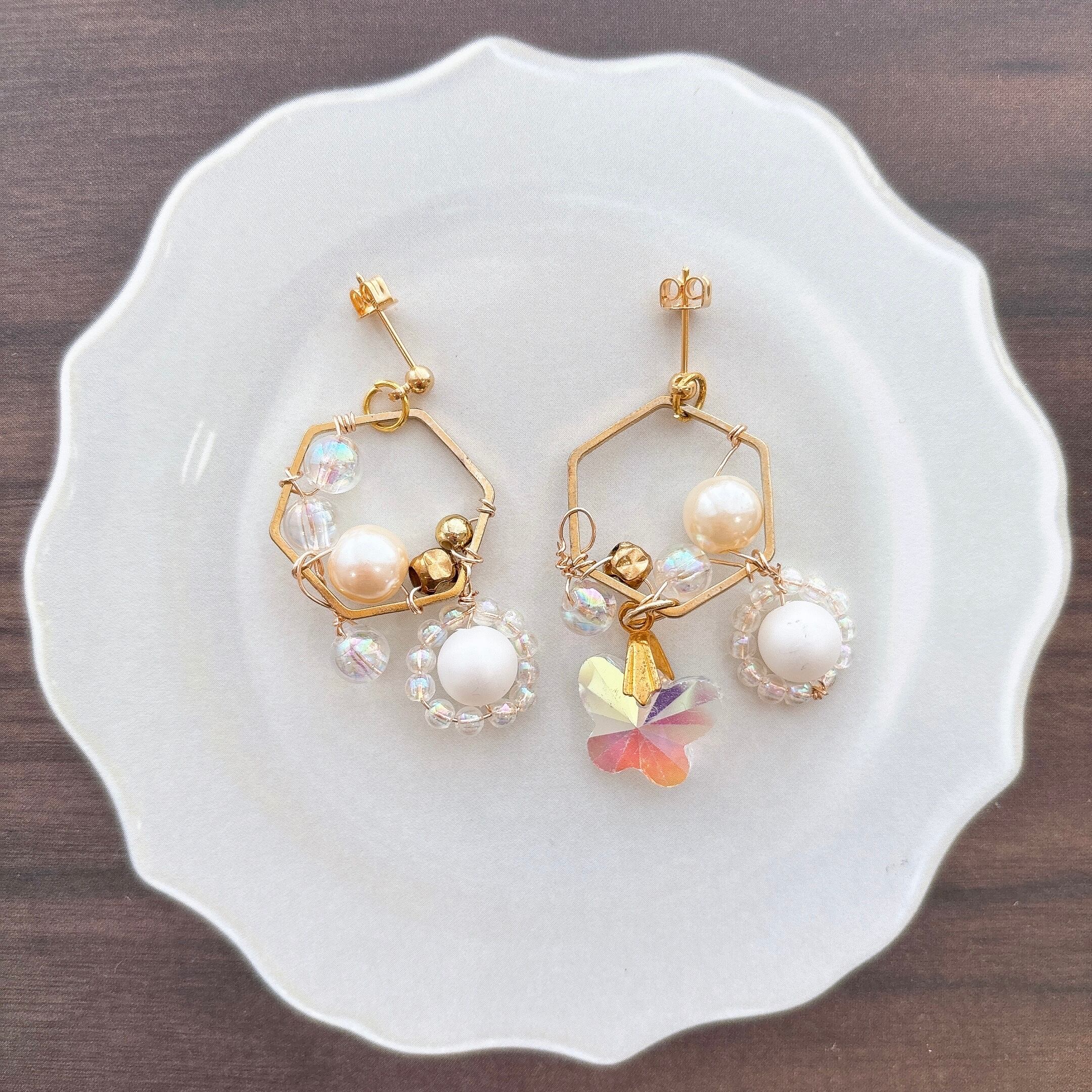 ピアス イヤリング きらきら 宝石 ビーズ ゴールド ホワイト 白 パール 蝶々 ゆらゆら 六角形 ヘキサゴン